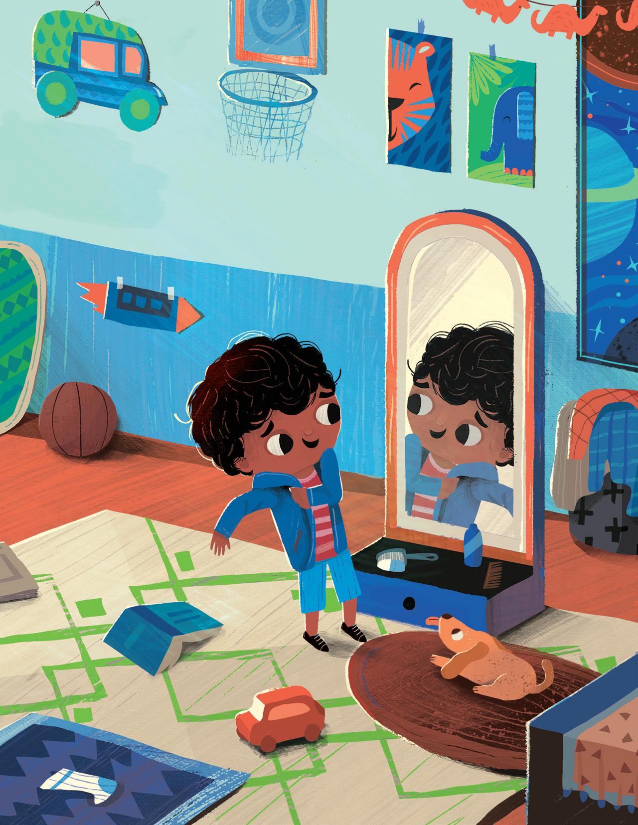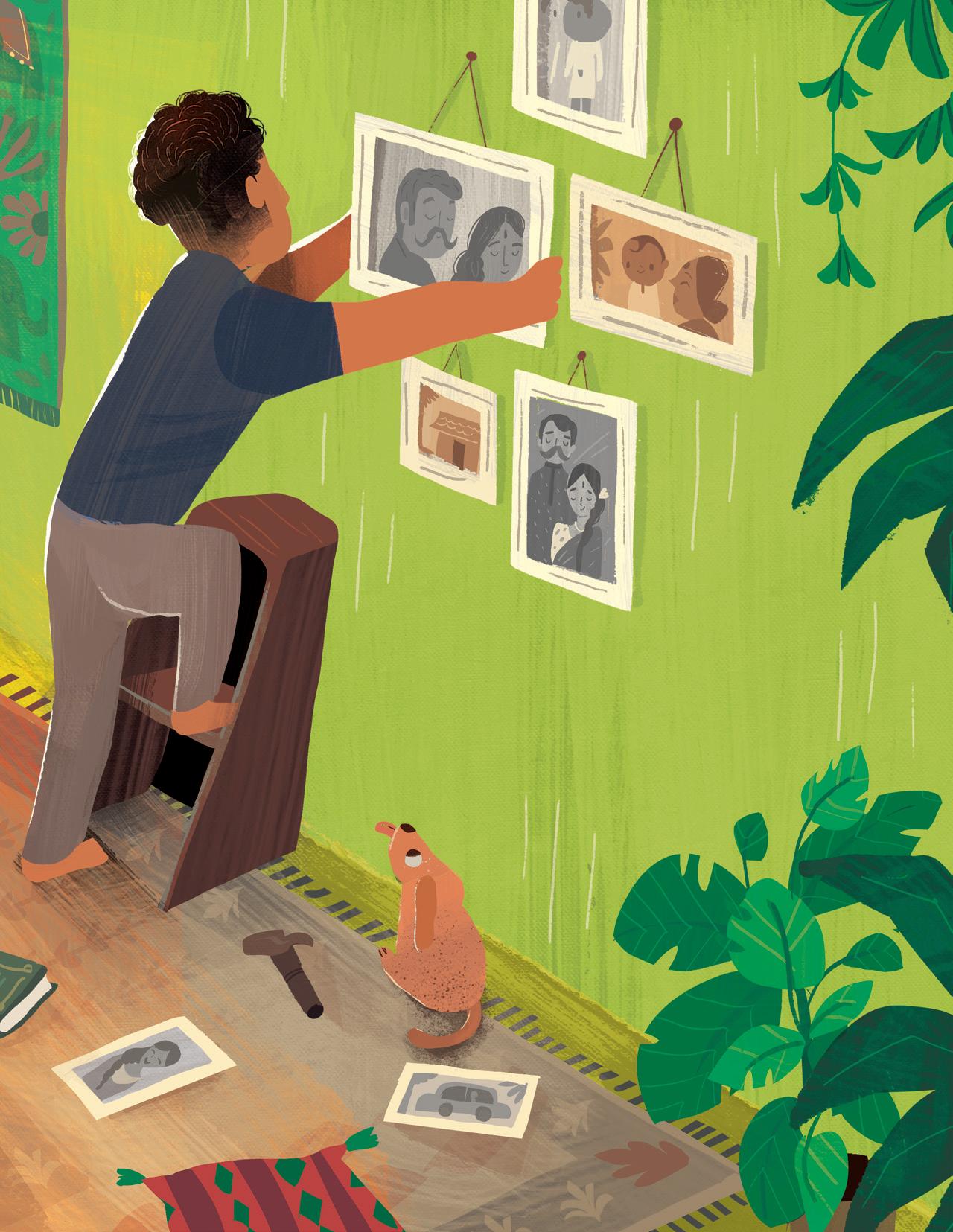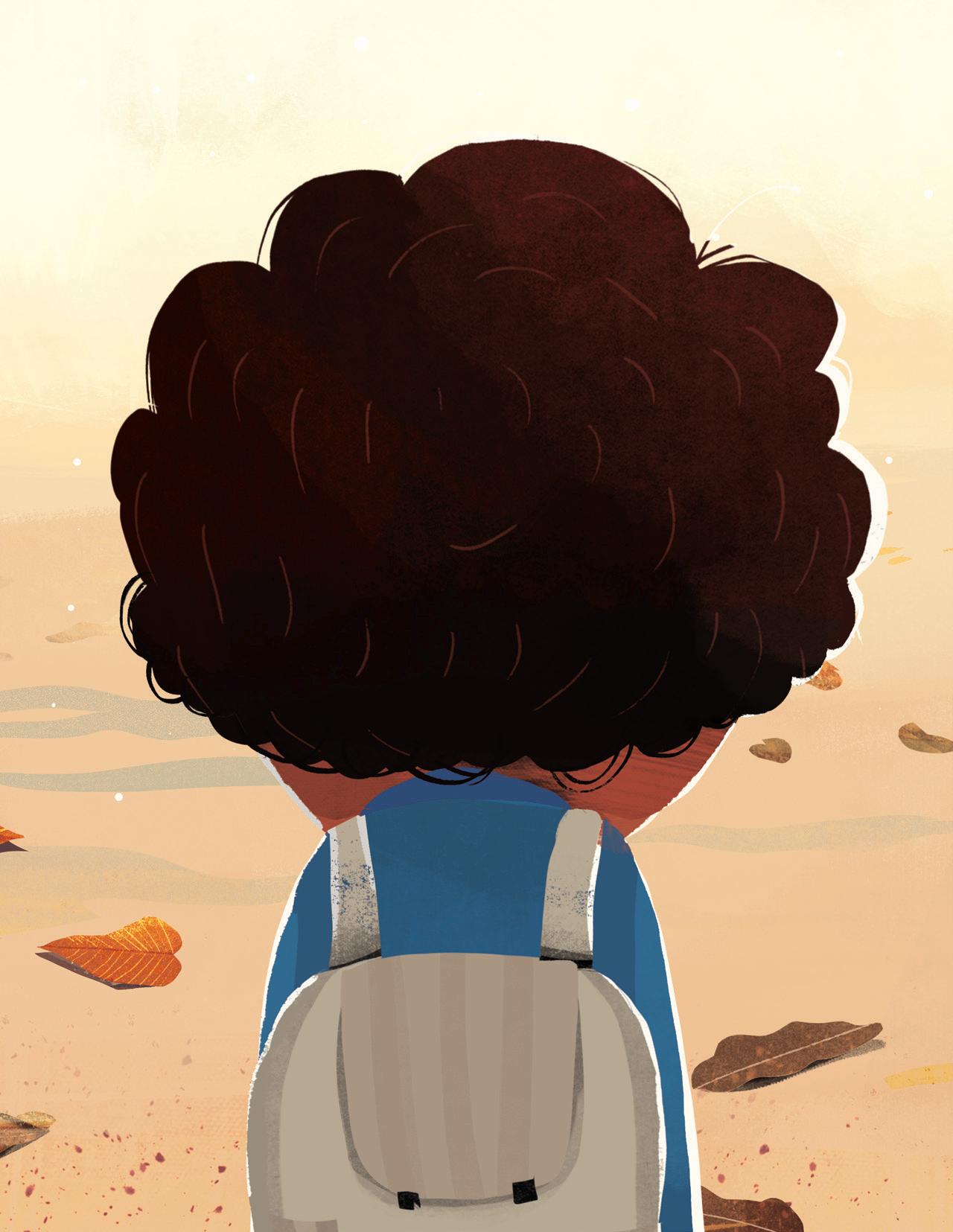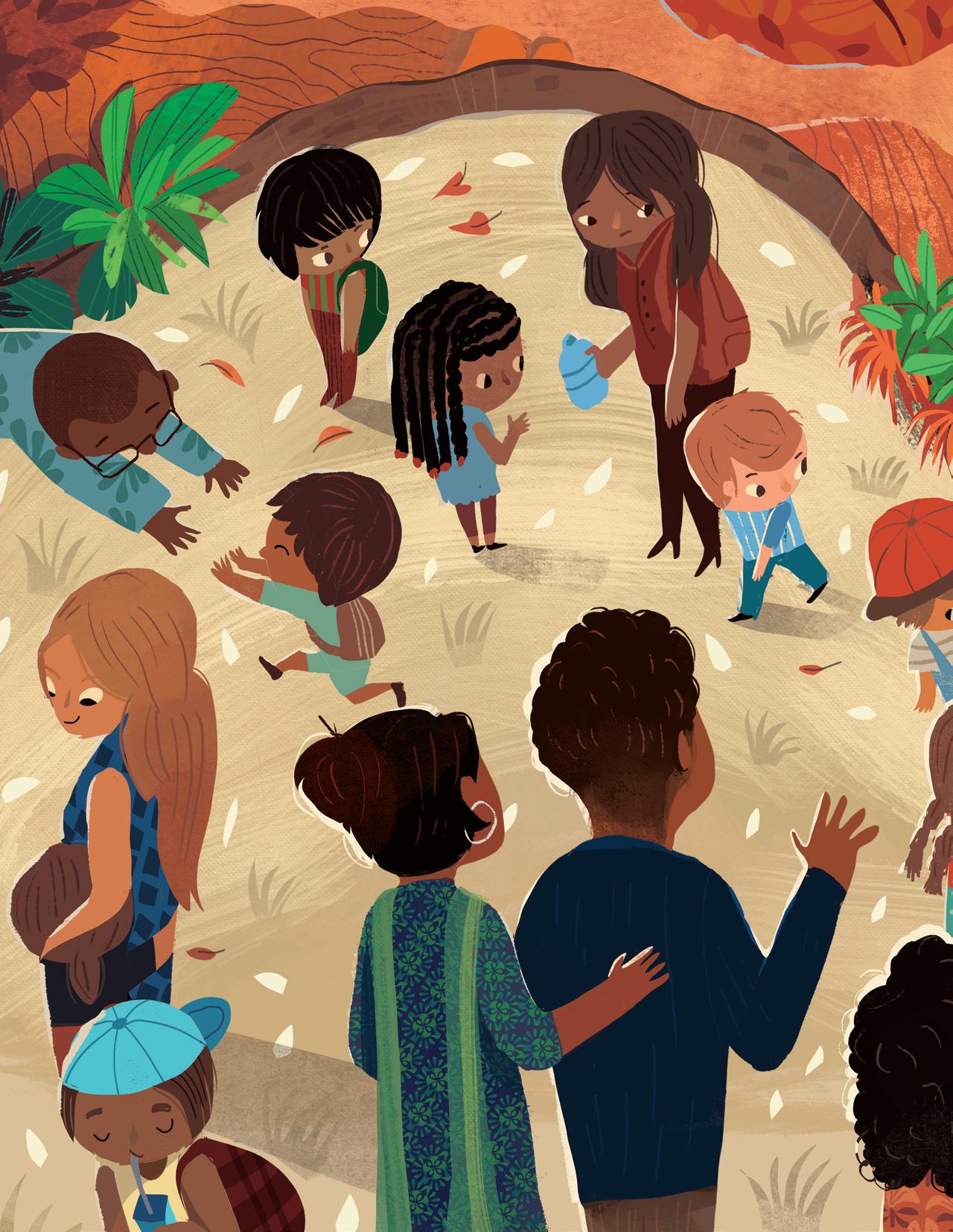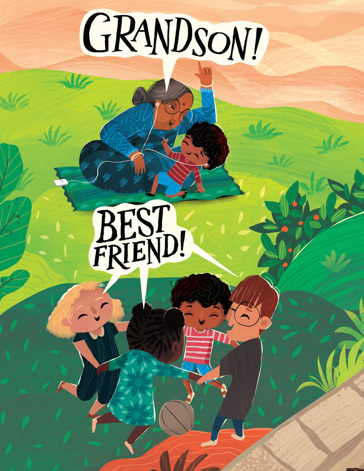 Supriya’s rhythmic and lyrical storytelling involved mirroring and revisiting scenes from the first part (the boy feeling embarrassed or frustrated) in the second part (the boy embracing his name), and I tried to do the same with my illustrations. I used recurring but modified imagery: mirroring spreads one after another, and turning cold, uncomfortable scenes in blue and green into warm and friendly moments in shades of orange and brown and yellow as his perspective changed. The inspiration for the cover came from a Maya Angelou quote that I love: “I come as one, but I stand as ten thousand.” Although the boy stands alone, he isn’t lonely. He brings with him his foremothers and forefathers, his friends and family, and feels strong and supported.