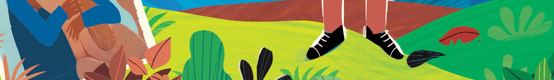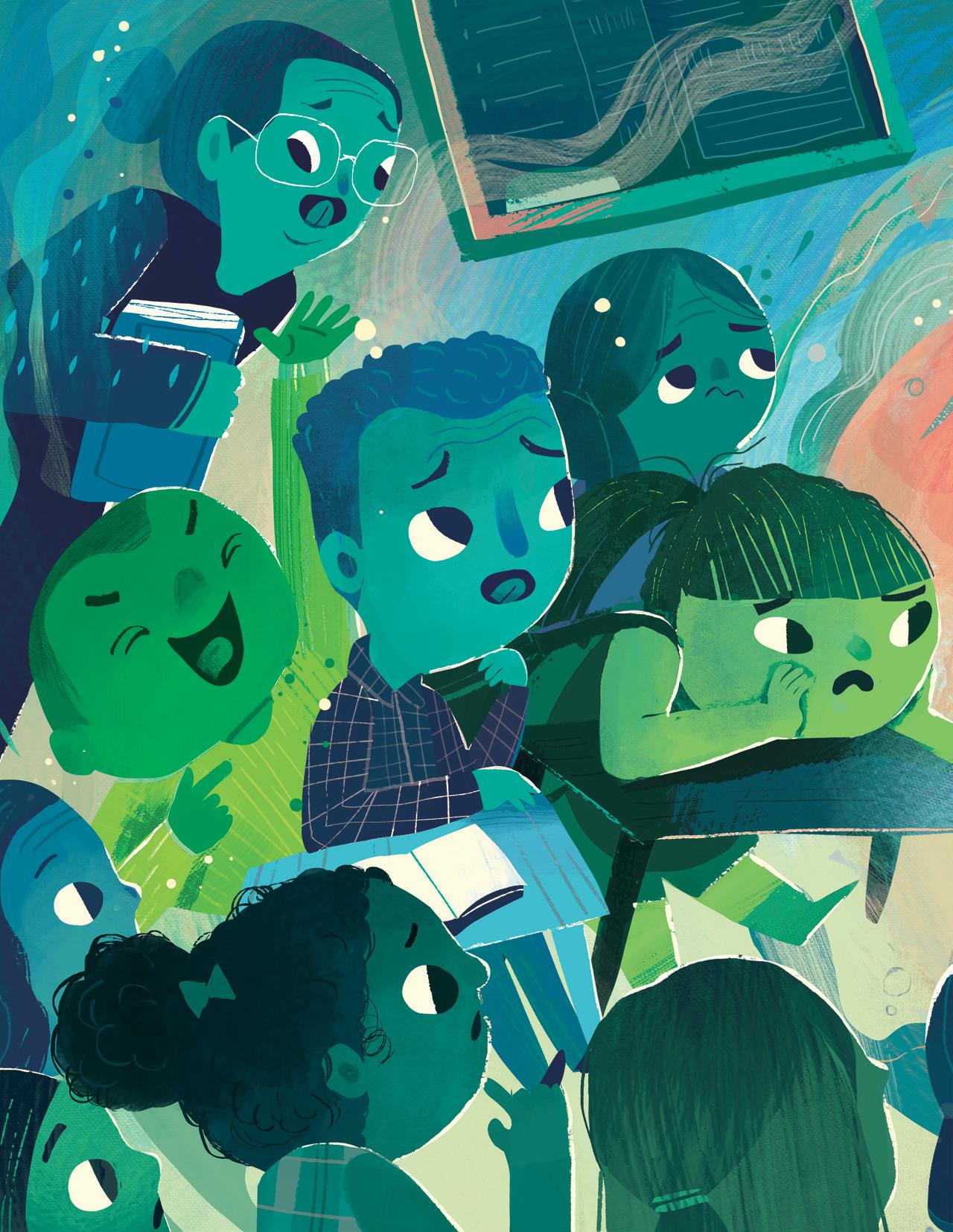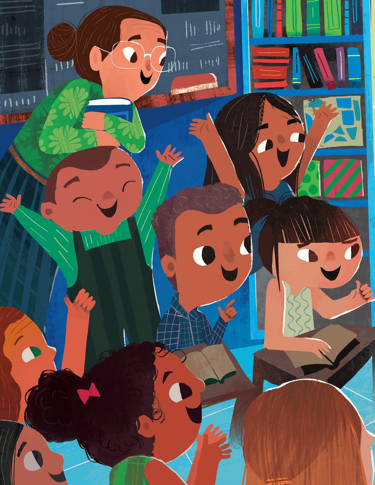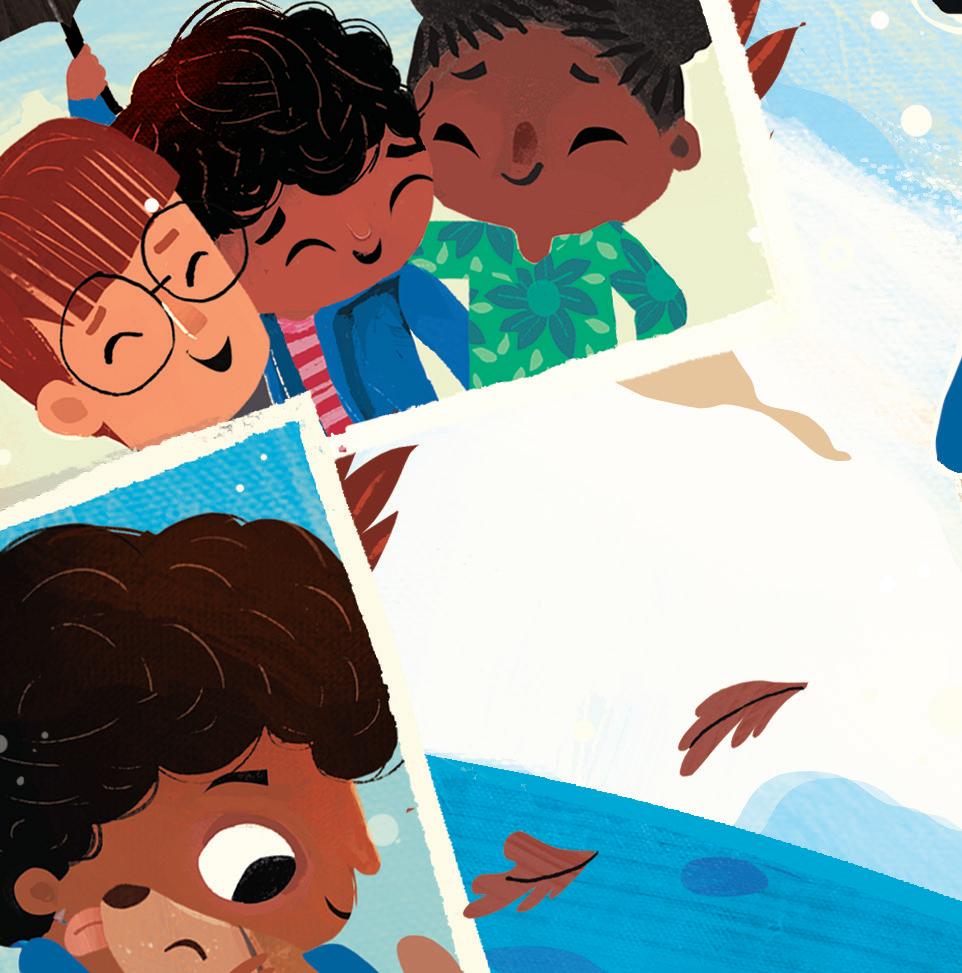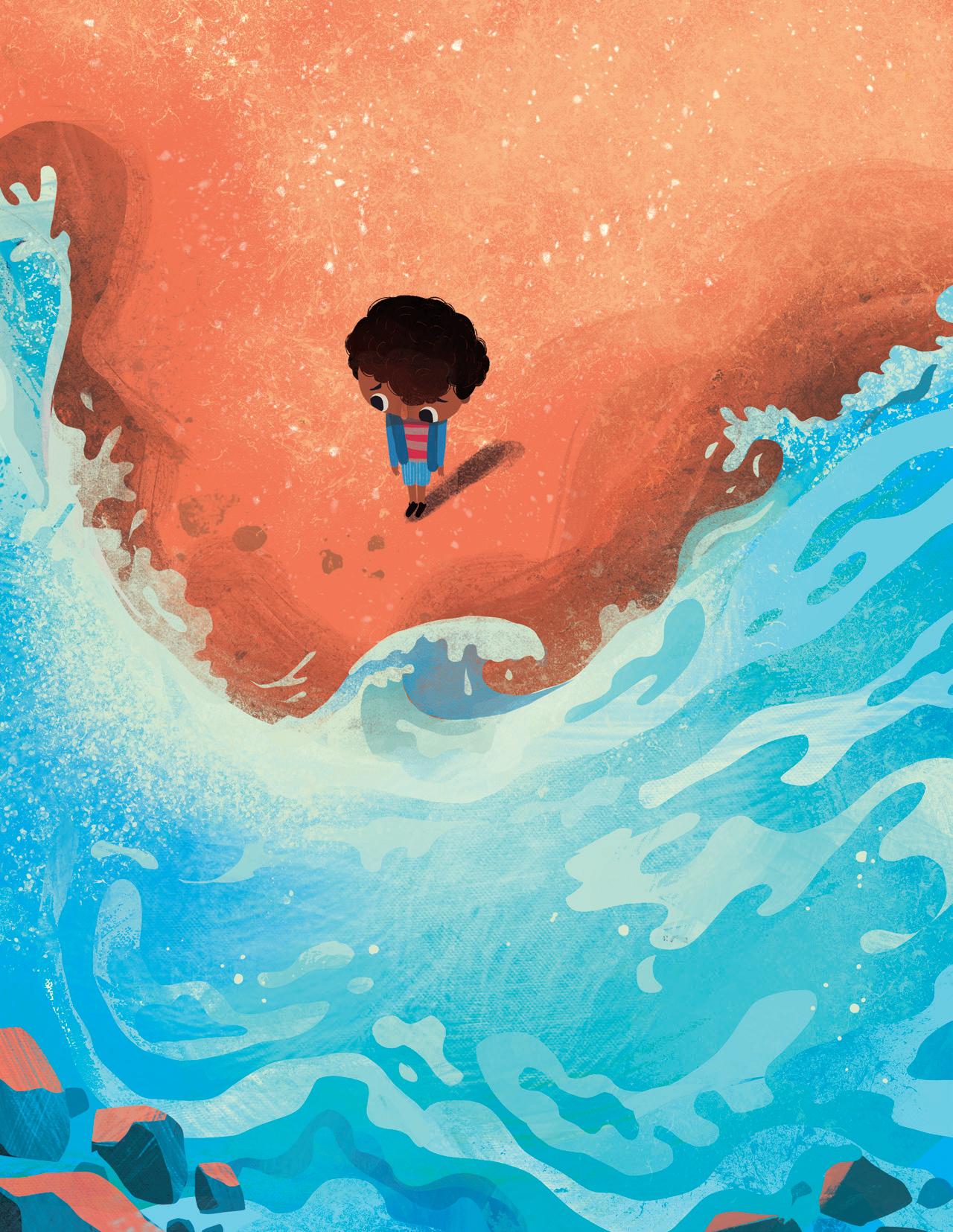Supriya’s rhythmic and lyrical storytelling involved mirroring and revisiting scenes from the first part (the boy feeling embarrassed or frustrated) in the second part (the boy embracing his name), and I tried to do the same with my illustrations. I used recurring but modified imagery: mirroring spreads one after another, and turning cold, uncomfortable scenes in blue and green into warm and friendly moments in shades of orange and brown and yellow as his perspective changed. The inspiration for the cover came from a Maya Angelou quote that I love: “I come as one, but I stand as ten thousand.” Although the boy stands alone, he isn’t lonely. He brings with him his foremothers and forefathers, his friends and family, and feels strong and supported.