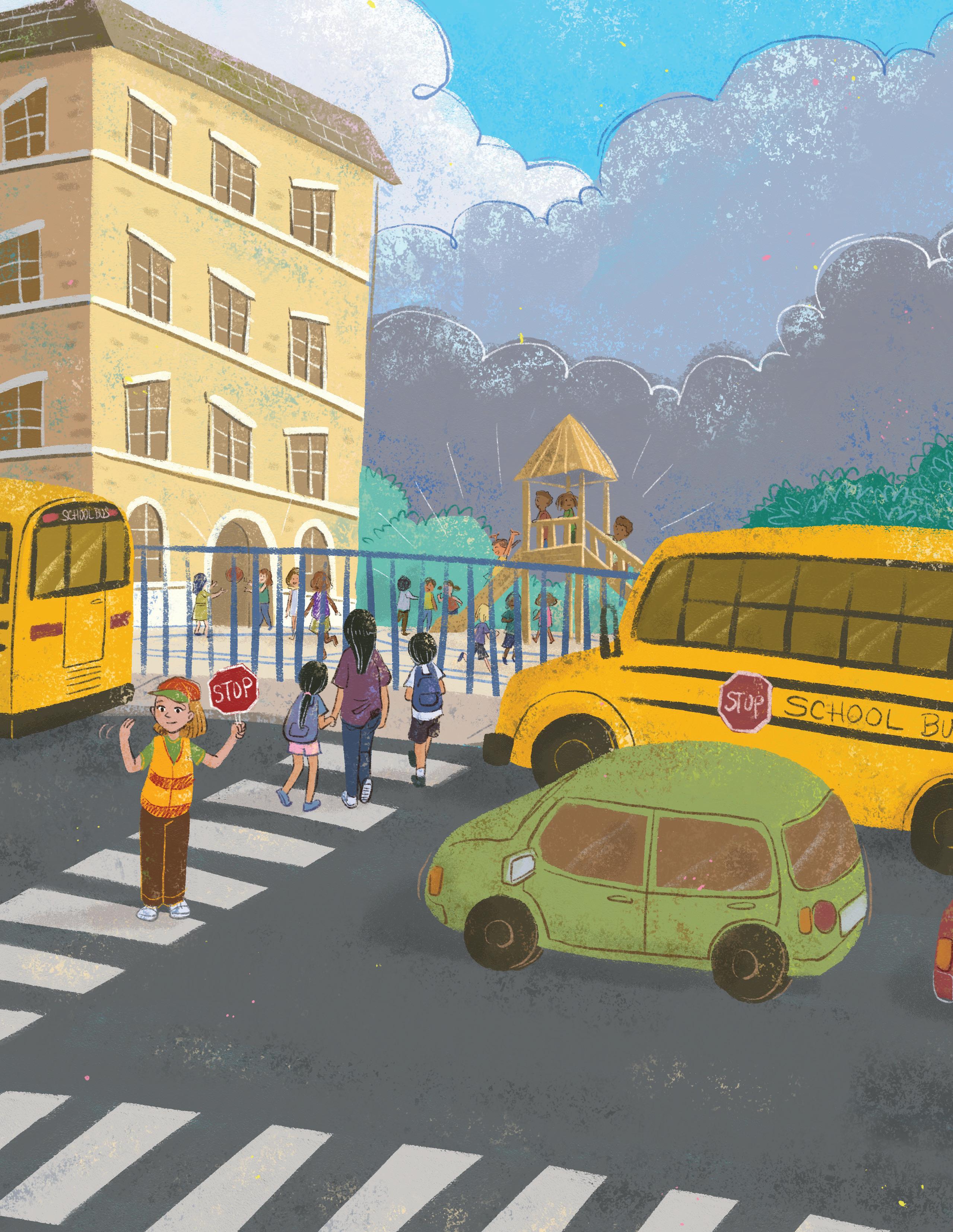 Isla’s heart went pún pún pún as each step took her closer. Mami squeezed her hand as the crossing guard busily waved them forward.