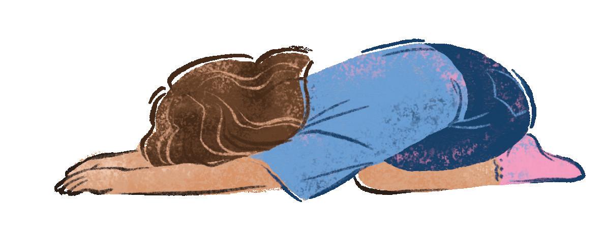 Sit back on your knees, positioning your feet shoelace-side down. Reach your arms forward and place your palms flat on the floor in front of you. Allow your head to gently relax in between your arms. Close your eyes and breathe into the pose, relaxing more with each breath.