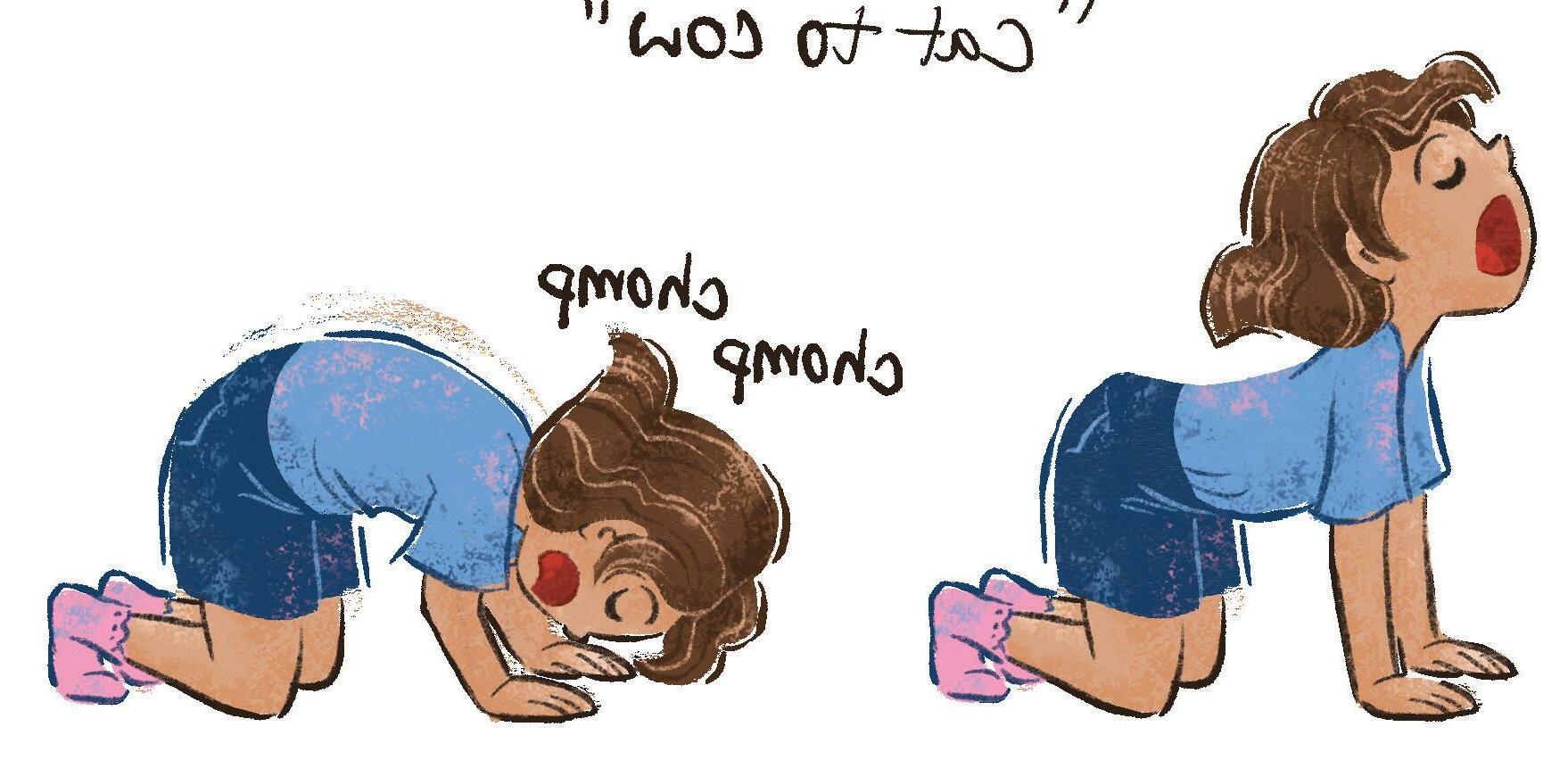 Come to the floor on your hands and knees, keeping your back in a flat, neutral position. Pretend you’re a cow. Chomp some grass. Breathe in as you raise your chin to the ceiling and curve your belly toward the floor. Pretend you’re a cat. Say “meow!” Breathe out as you tuck your chin in and round your back.