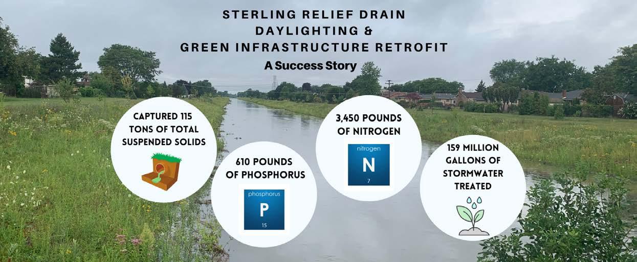 TheMacombCountyPublicWorksOffice’s “daylightingandgreeninfrastructureretrofit” oftheSterlingReliefDraininSterlingHeights wasawardedProjectoftheYearinthe categoryofQualityofLife/$1Millionto $5Million,bytheMichiganchapterofthe AmericanPublicWorksAssociation.