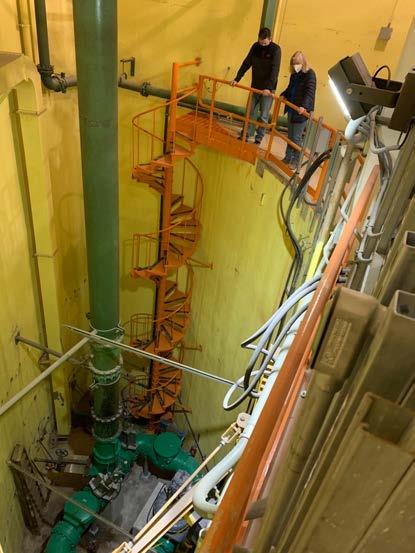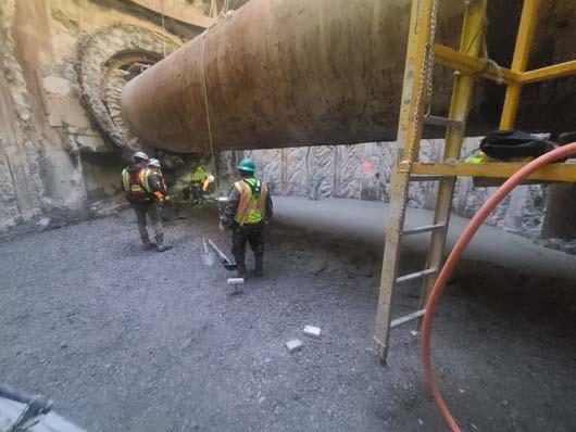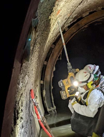 AtSegment5oftheMacomb InterceptorDrainsewerrehabilitation, on15MileRoadintheITCcorridor,the constructioncontractorworksatthe bottomoftheshaftandnexttothe flumecarryingthesanitarysewage fromthe11communitiesinthe MacombInterceptorDrainDrainage District.