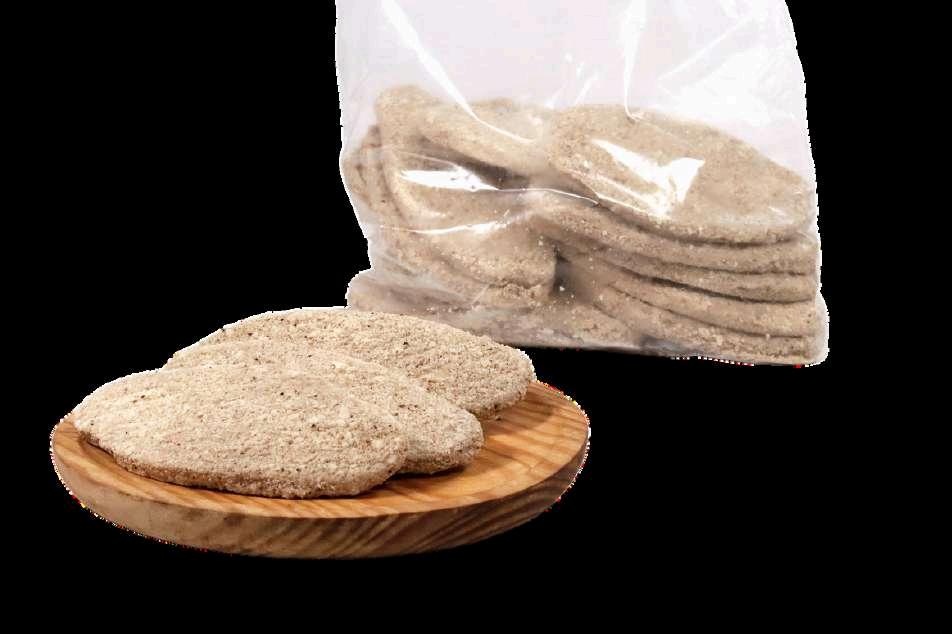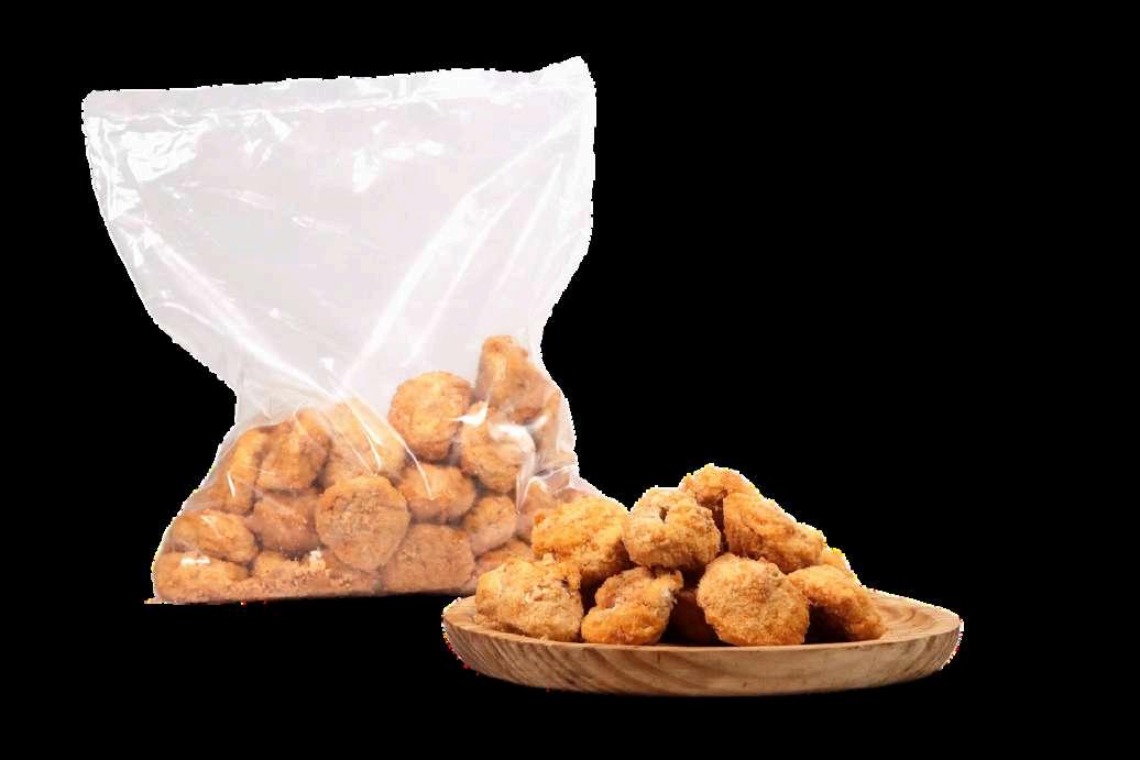 carnica a base de pierna y muslo con forma redonda y empanizada.