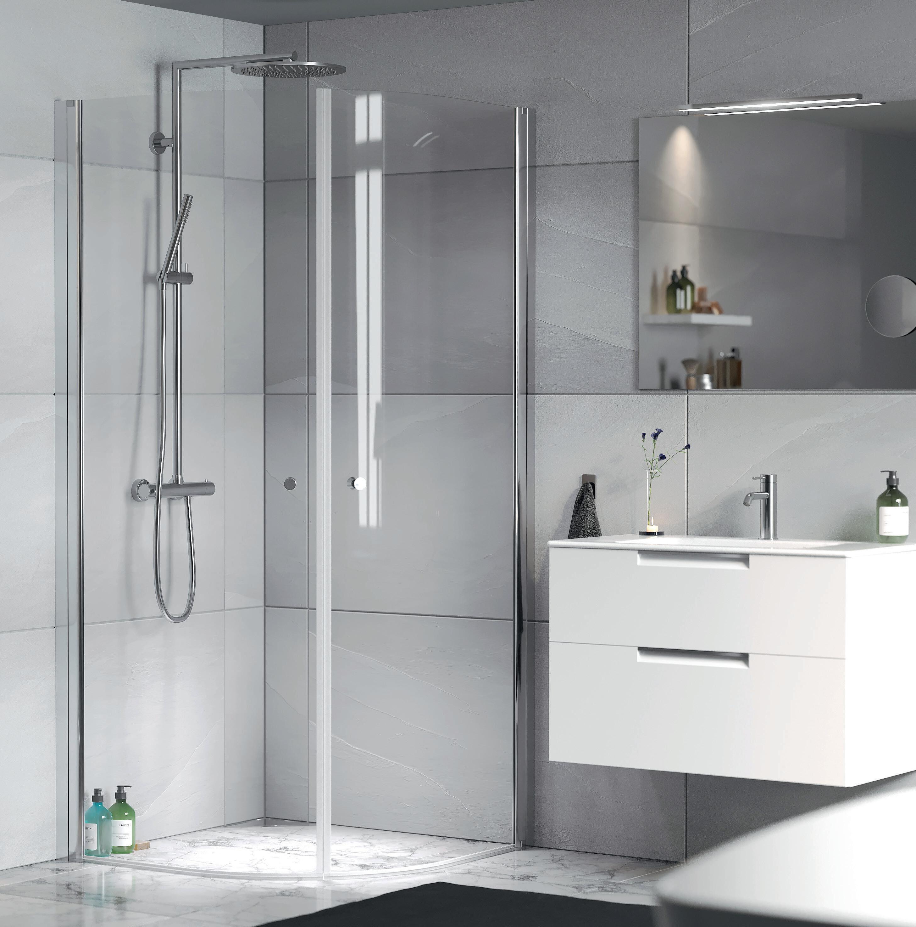 I duschpaketet ingår Spirit duschhörna Rund eller Rak med Asti takdusch i matchande färg, krom eller mattsvart.