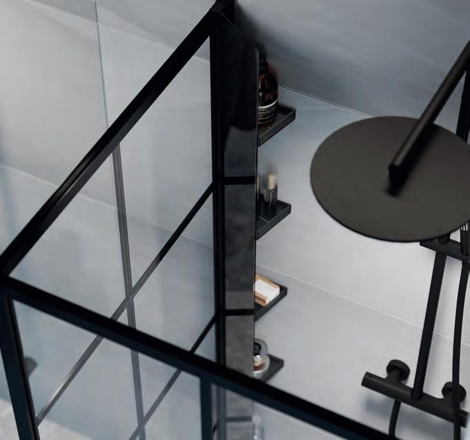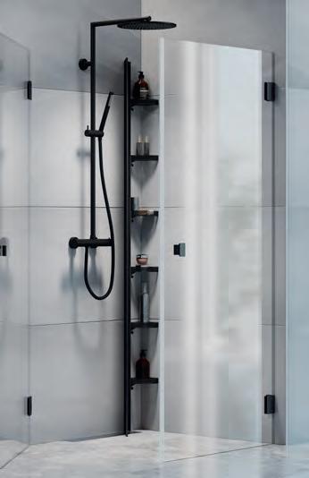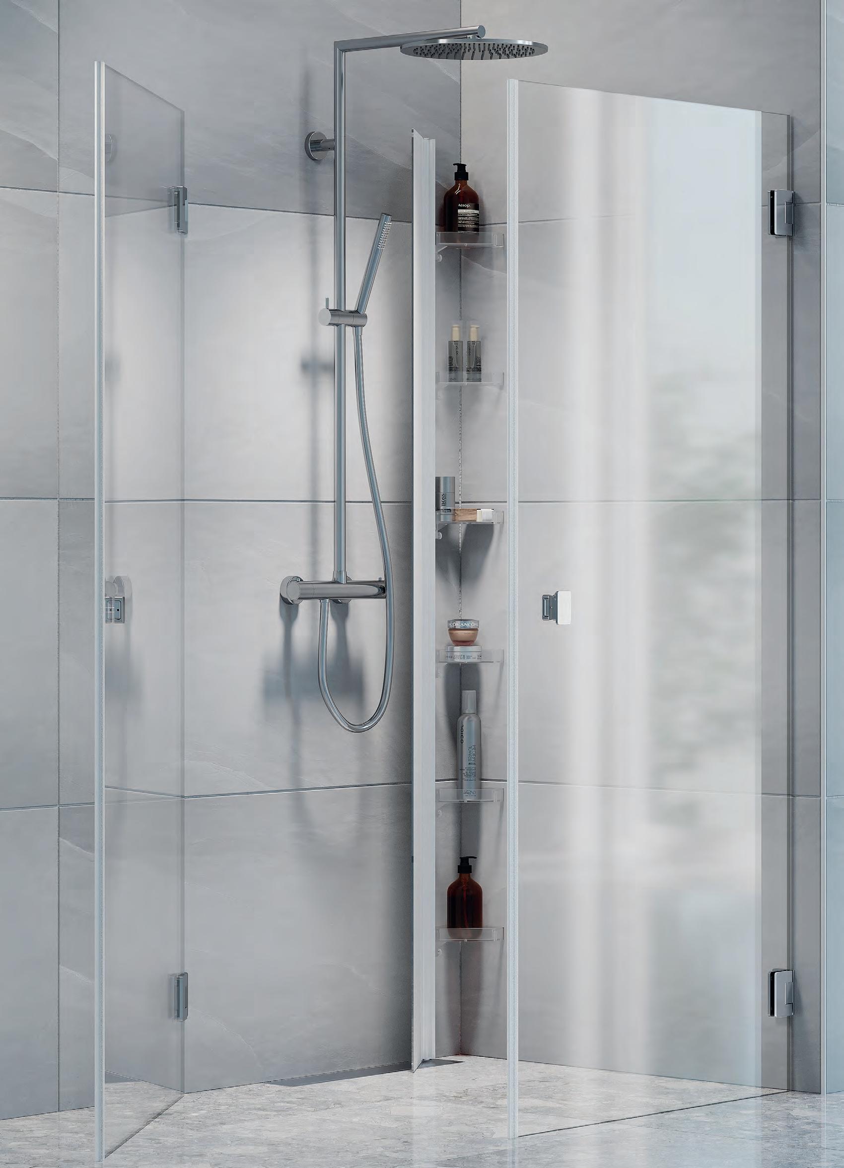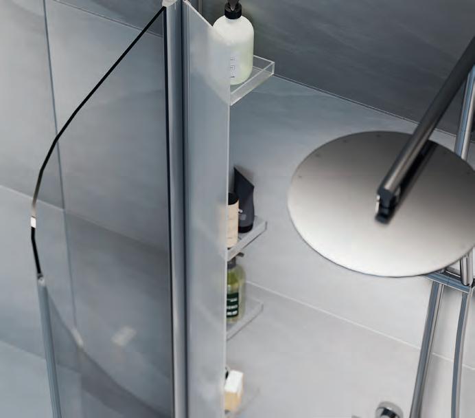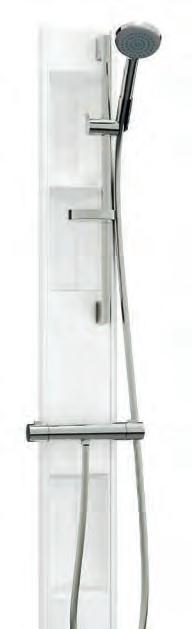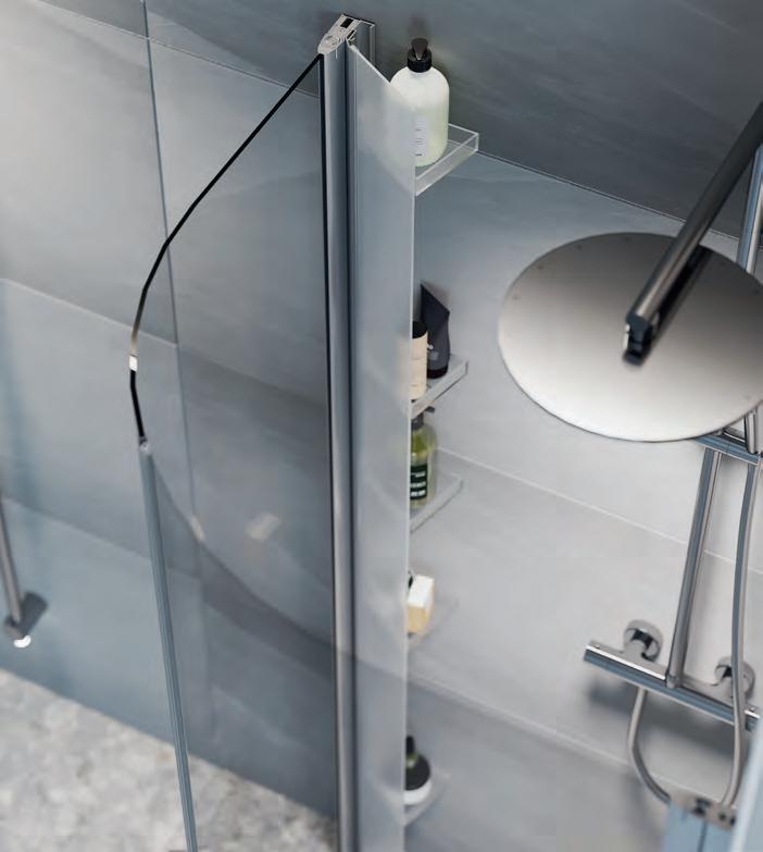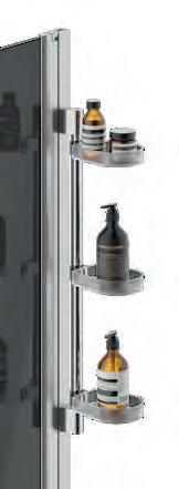 Stilren hylle med god dusjoppbevaringsplass som på en smart måte skjuler alle dusjprodukter. Monteres enkelt på dusjveggens veggprofil.