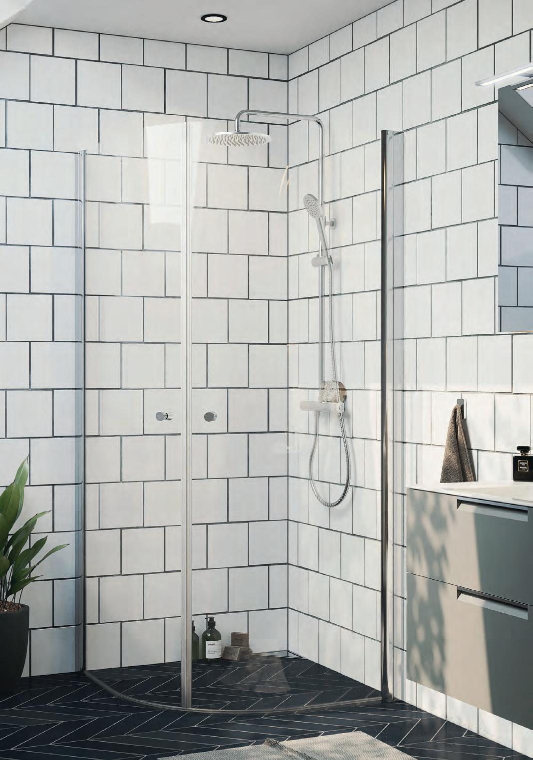 Med en dusj med rundt design skaper du en mykere følelese i ditt baderom, samt bedre plass utenfor dusjen. Spirit Rundt monteres i et av baderommets hjørner.