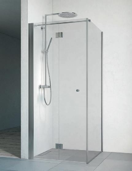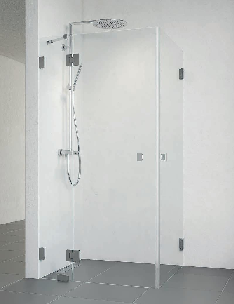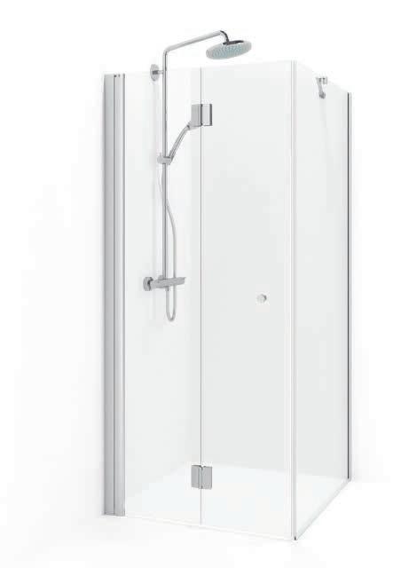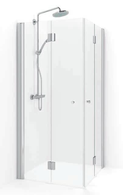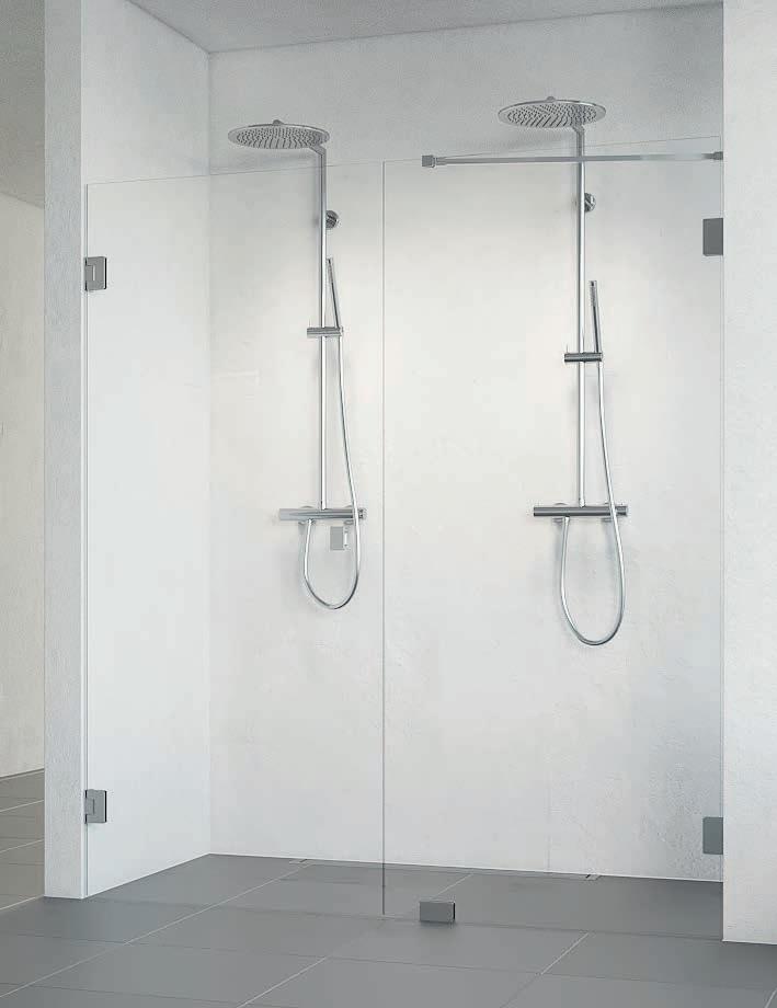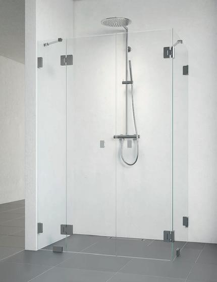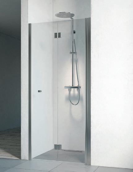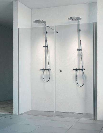 En dusjløsning med hengslede dører som kan skyves inn på midten og så legges inn til veggen. En perfekt løsning i bad der toalett eller vask er plassert kloss inn til dusjen.