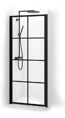 Skärmvägg Empire med svart ram och linjeglas. Glasets regelbundna struktur skyddar från insyn samtidigt som det släpper in ljus och möter upp Empires minimalistiska formspråk.