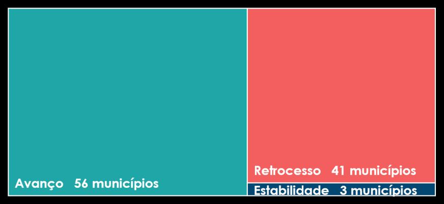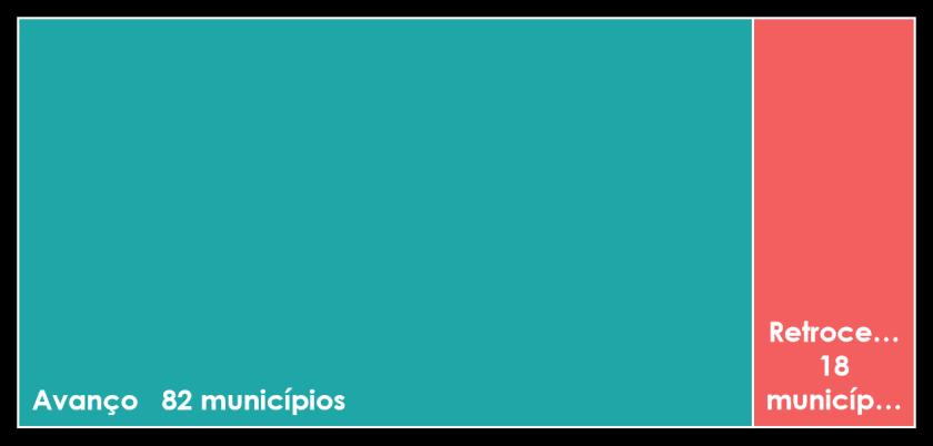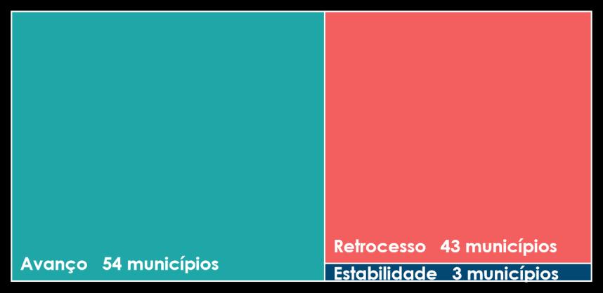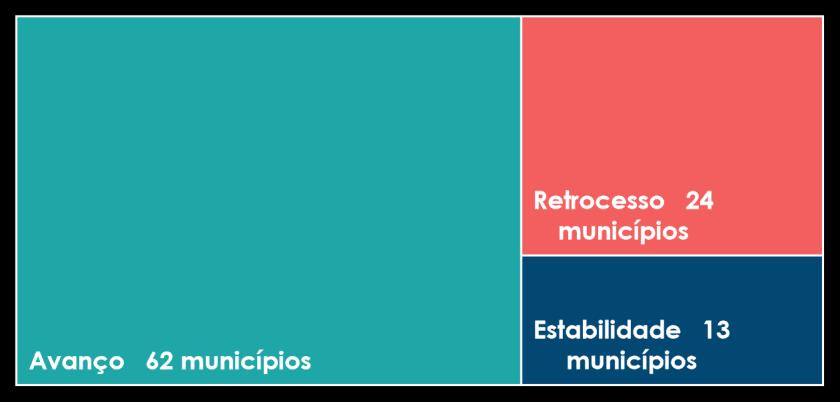 A análise do último ano mostra sinais de deterioração. A maior parte dos municípios (80) progrediu, mas 19 exibiram piora do Índice, enquanto um revelou estagnação. Os municípios que registraram queda ou estagnação do Índice estão distribuídos em sete estados e em quatro regiões: um município no Norte; um no Nordeste; 13 no Sudeste; cinco no Sul.