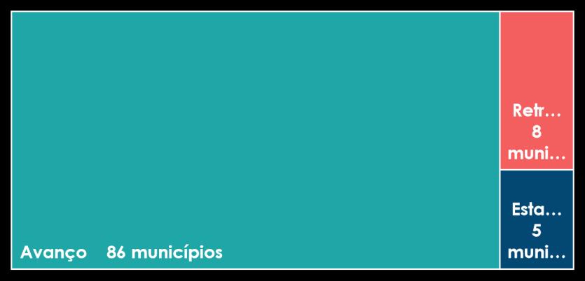 Desempenhos negativos foram observados em todas as áreas, sendo mais frequentes em Saúde (55 pioraram e um município estagnou) e em Saneamento e Sustentabilidade (29 pioraram e cinco estagnaram) do que em Segurança (16 pioraram e um estagnou) e Educação (sete pioraram).