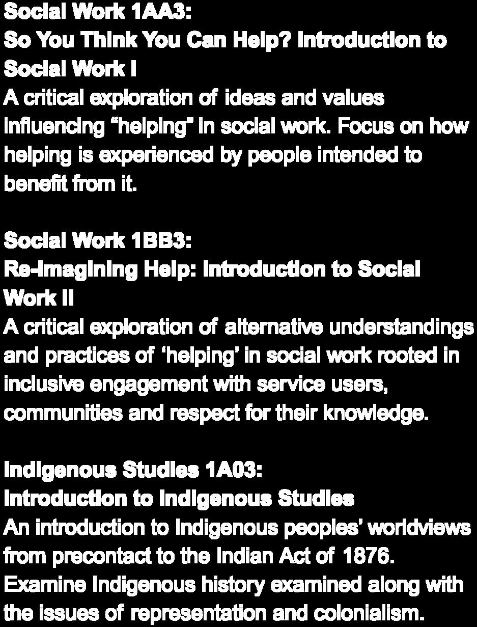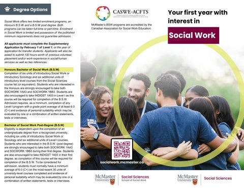 Completion of six units of introductory Social Work or introductory Sociology and six additional units of introductory level courses from the Social Sciences course list (or equivalent) Students who are interested in the Honours are strongly encouraged to take both SOCWORK 1AA3 and SOCWORK 1BB3 Students are also encouraged to take INDIGST 1A03 in Level I as this course will be required for completion of the B.S.W. Admission requires, as a minimum, completion of any Level I program with a grade point average of at least 6.0 (C+) and evidence of personal suitability which may be evaluated by one or a combination of written statements, tests or interviews.