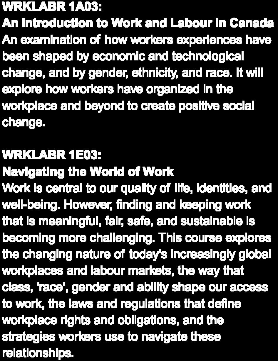 Work is central to our quality of life, identities, and well-being. However, finding and keeping work that is meaningful, fair, safe, and sustainable is becoming more challenging. This course explores the changing nature of today's increasingly global workplaces and labour markets, the way that class, 'race', gender and ability shape our access to work, the laws and regulations that define workplace rights and obligations, and the strategies workers use to navigate these relationships.