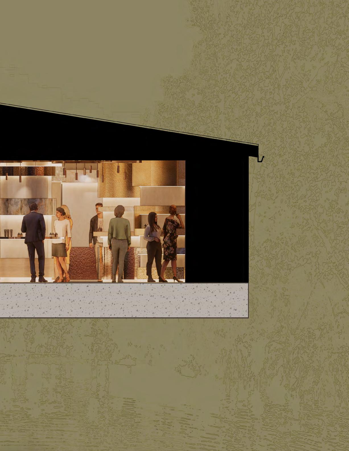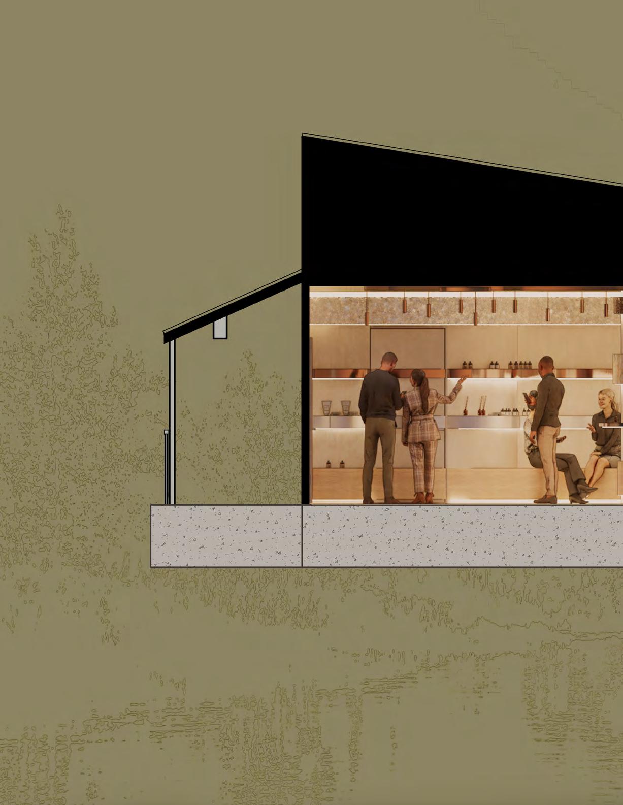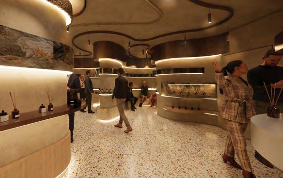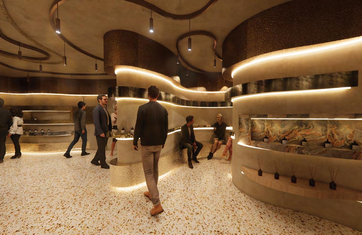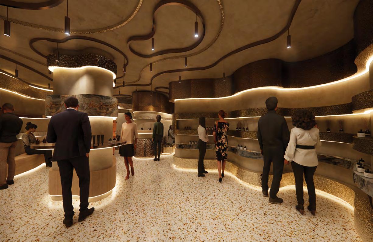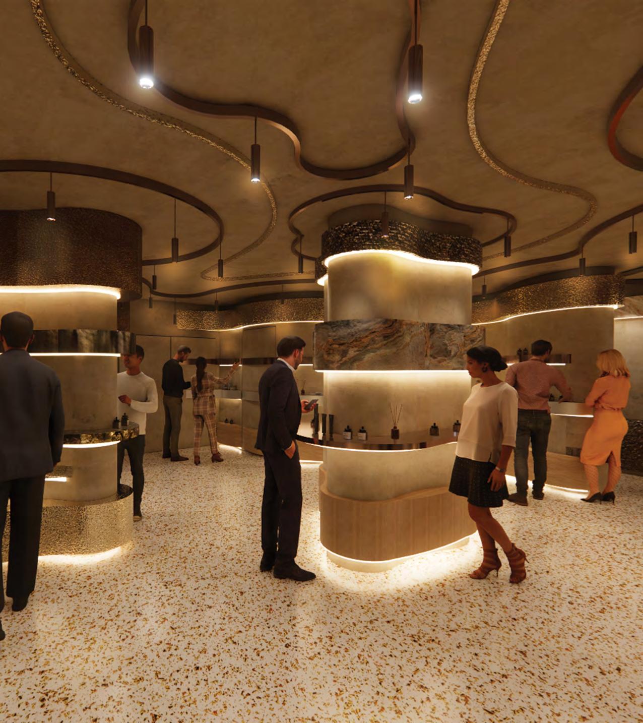 The project uses the scent of amber as a conceptual foundation. Amber is often associated with sensuality, softness, richness, and a natural, earthy aroma. These qualities translate into the architectural design as warm, tactile materials and organic forms and design motifs that reflect the complexity and depth of the fragrance.