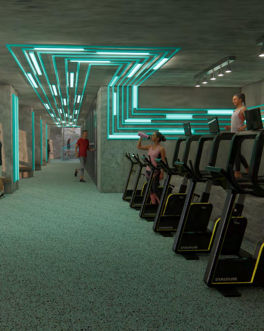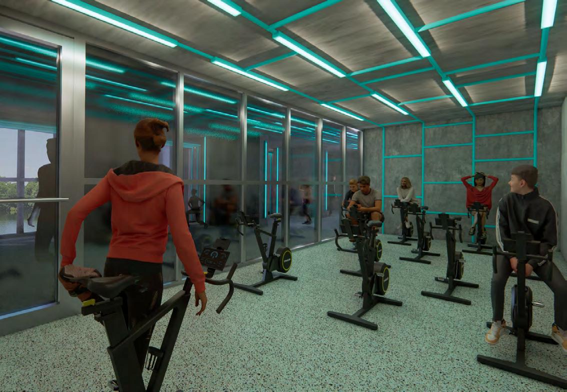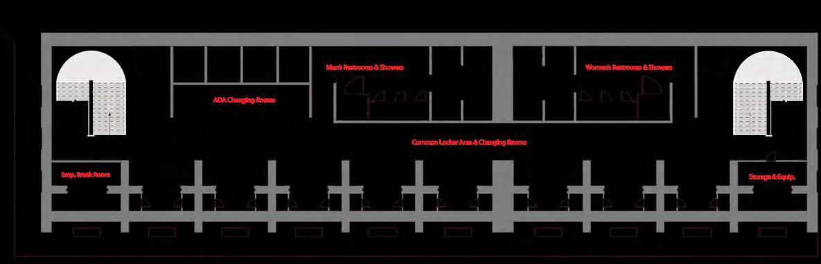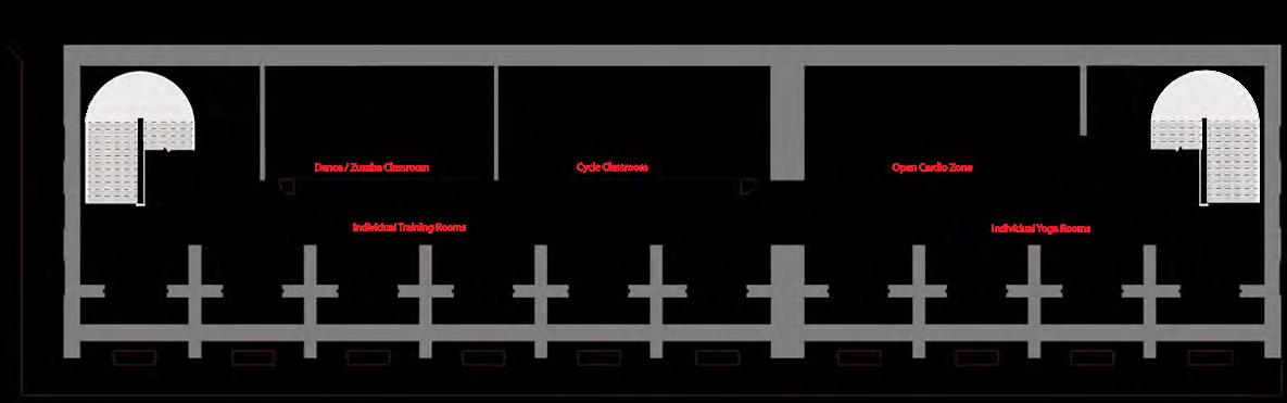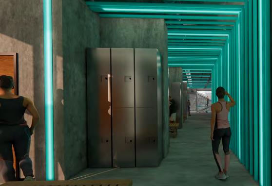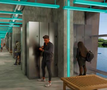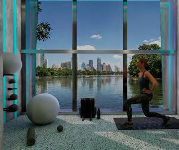 Acting as a central hub, this floor contains an open locker room and restrooms with an exceptional view of Lady Bird Lake, providing an excellent transitional space between workouts. By placing this programming in the middle, there is balanced access across all floors, ensuring convenience for gym-goers.