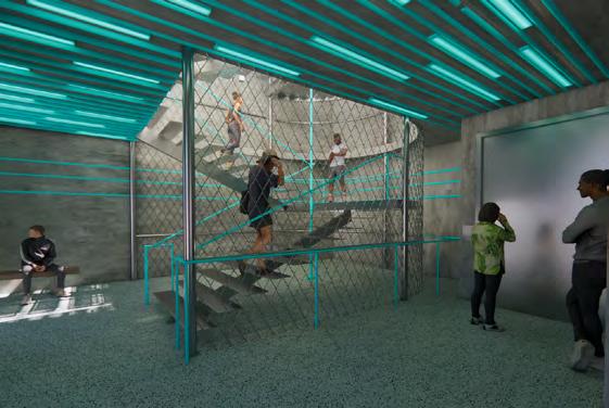 This form of design also acts as a way-finding technique and guides the gym goers throughout various levels of the Seaholm Gym, containing a weight room, cardio section, zumba and spin cycle classrooms and open training zones and a gender neutral locker room that has a breathtaking view of Lady Bird Lake and the outdoors.