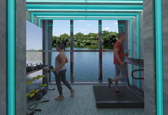The lower floor is more intimate, with areas dedicated to personal training, cardio, yoga and group classes, creating a more personal and focused workout experience, with a water level view of the lake and natural lighting.