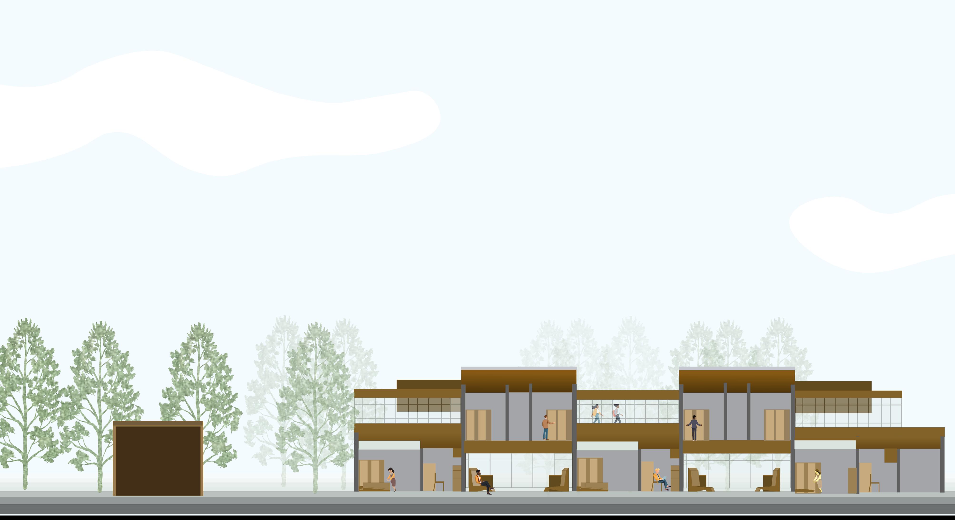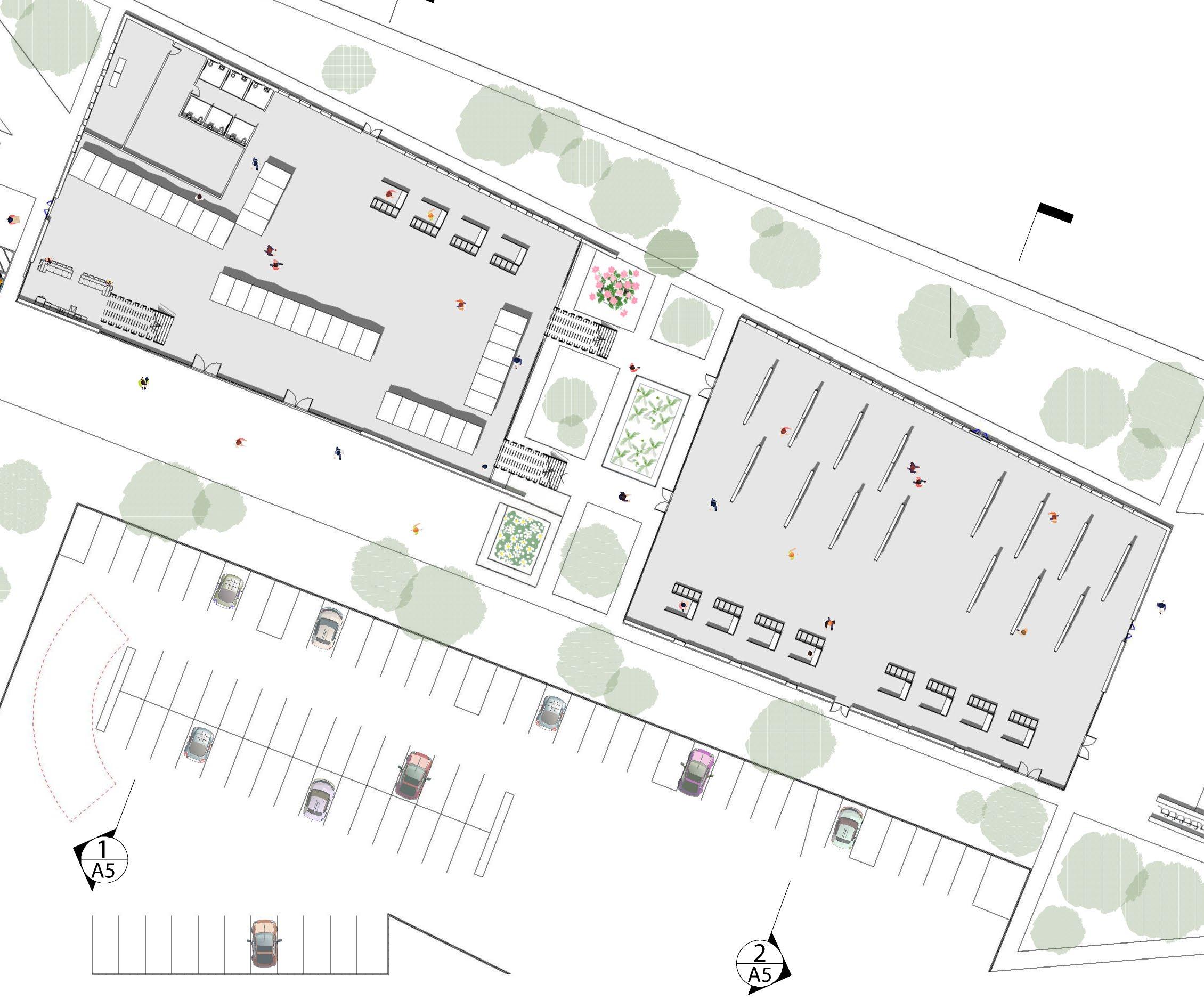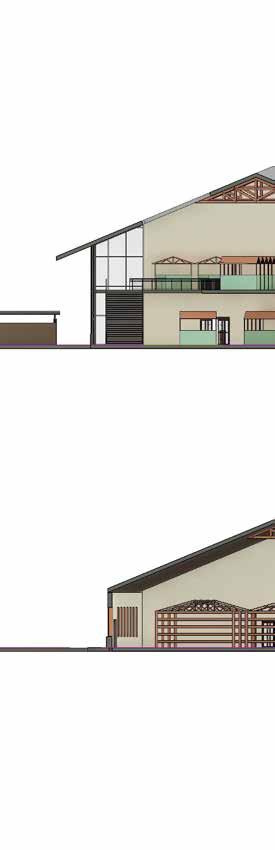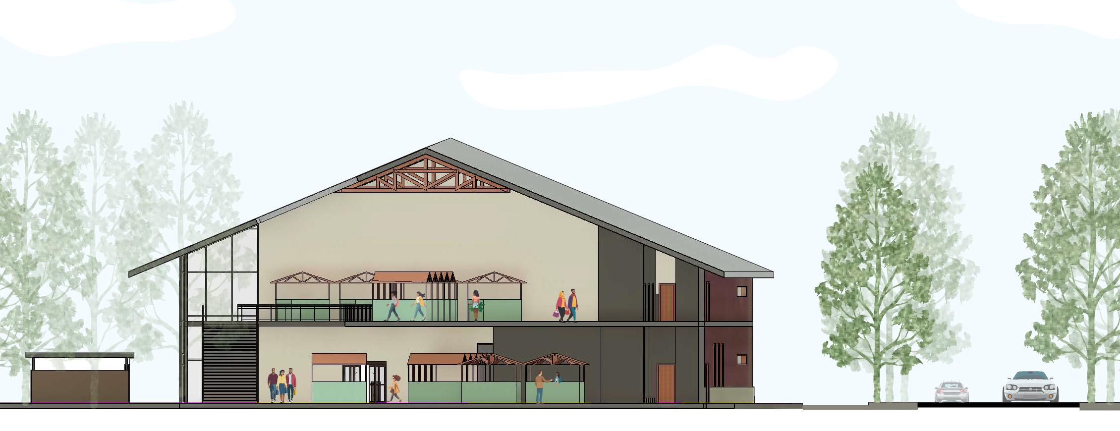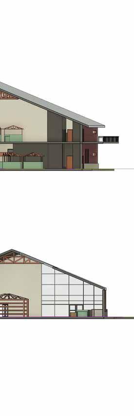These section views display activity within both buildings. The top view is the left buliding, where the main market stalls are located. The bottom view is a section of the right building, which shows the hydroponic racks and checkout stations.