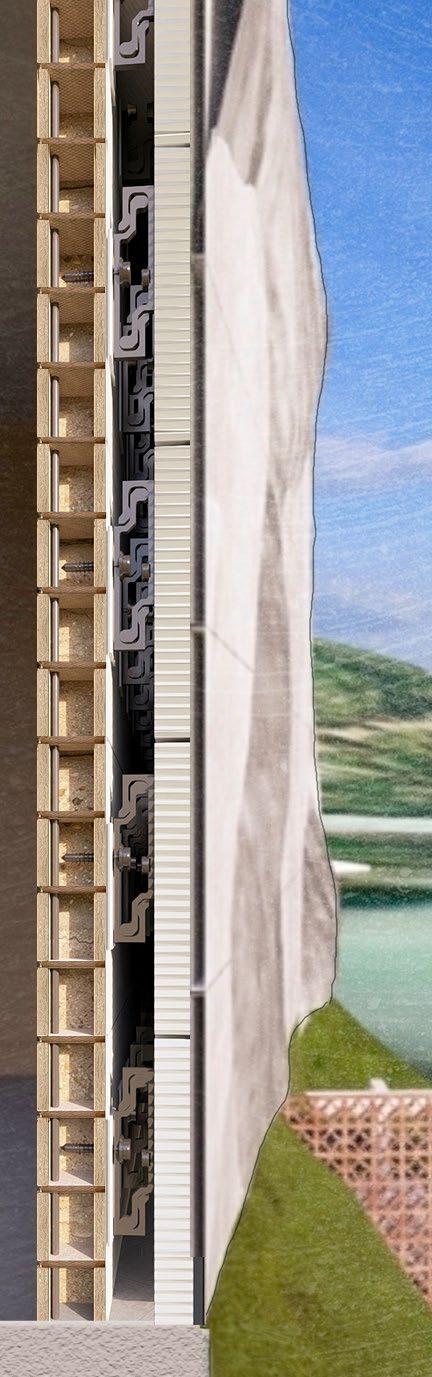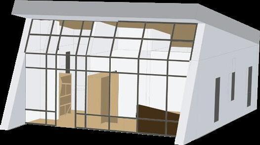The rendering on the left showcases the composition of the stone panels mounted on the CMU blocks. The natural stone panel on the exterior relates to the untouched context in Concow, California.