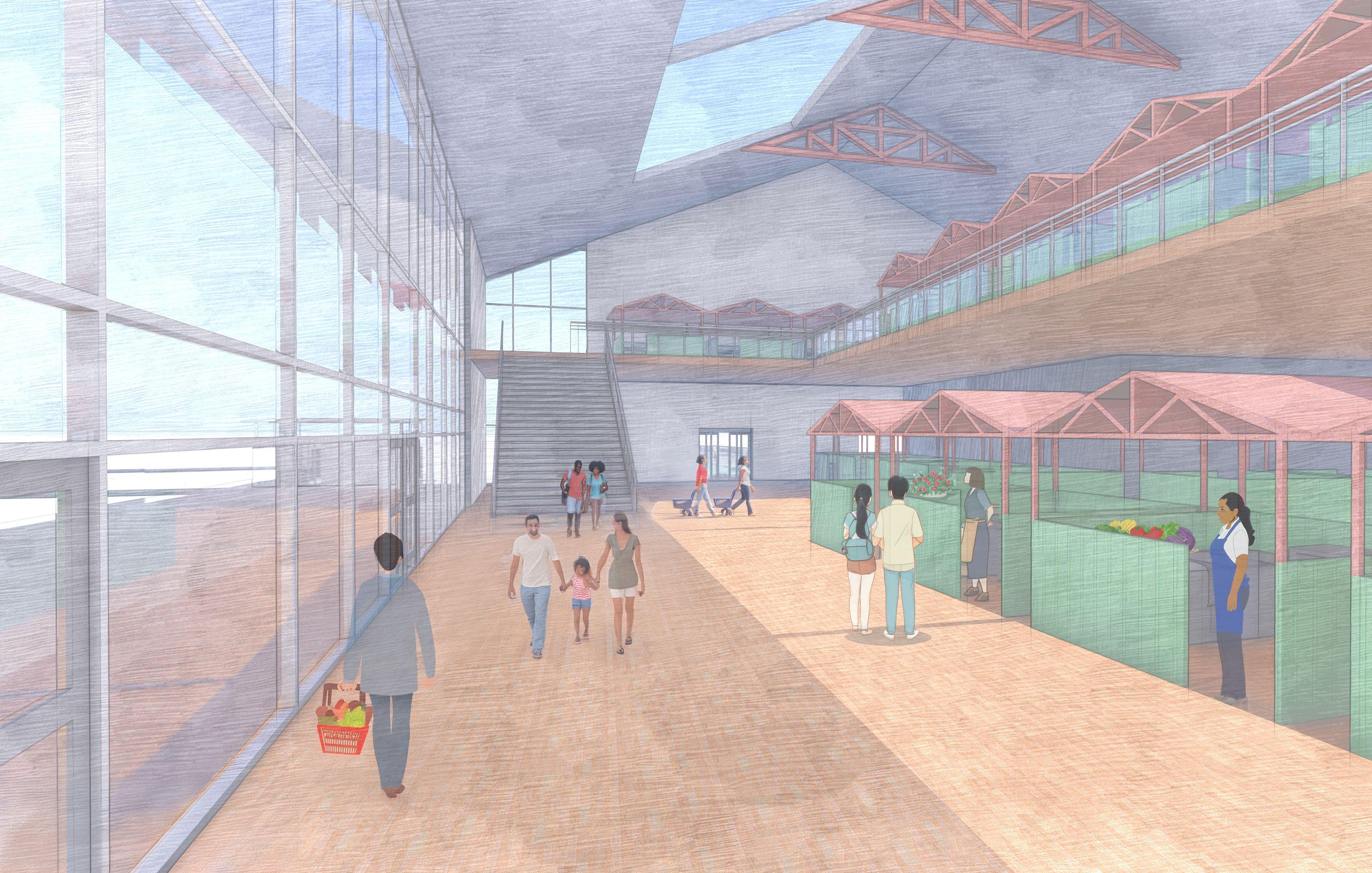 The view above is showing activity within the left building. Market stalls line the interior, with small business vendors occupying the space. There is a balcony space on the second floor, which allows for visibility and a grand feeling within the market space.