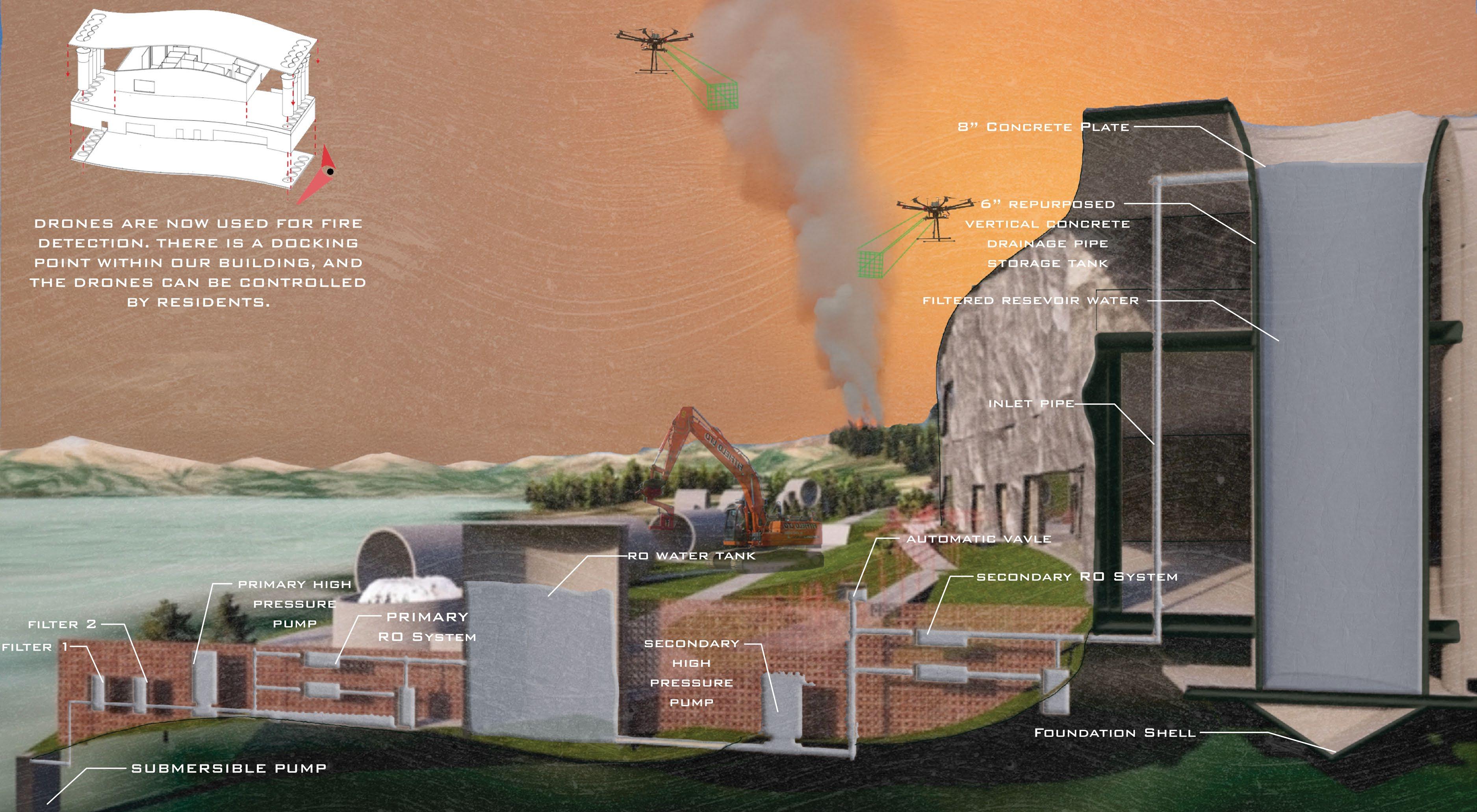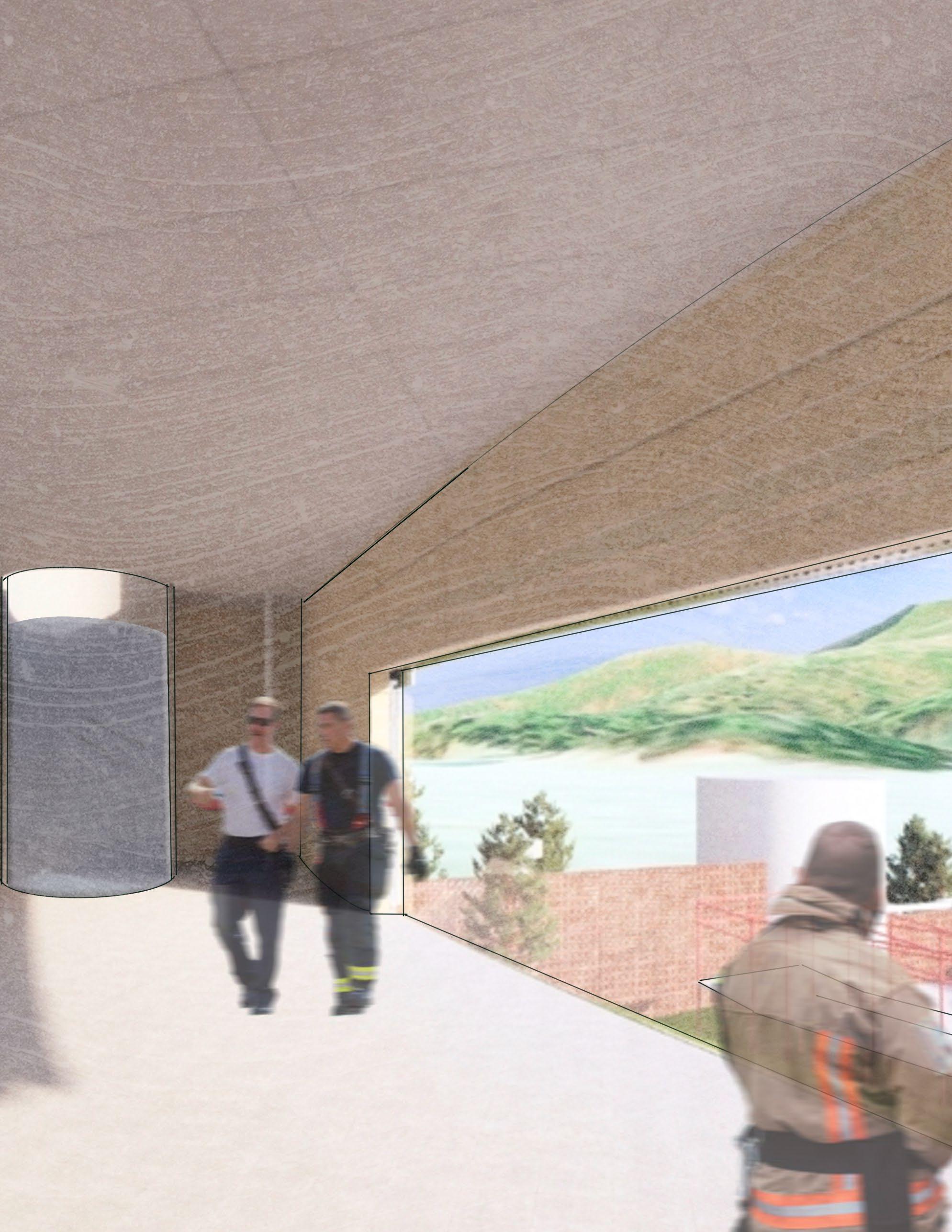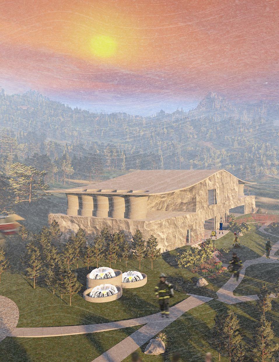 The building is also a residence for firefighters, and contains site elements that benefit training but also utilize materials recovered from past wildfires, such as old concrete drainage pipes, to recycle local materials.