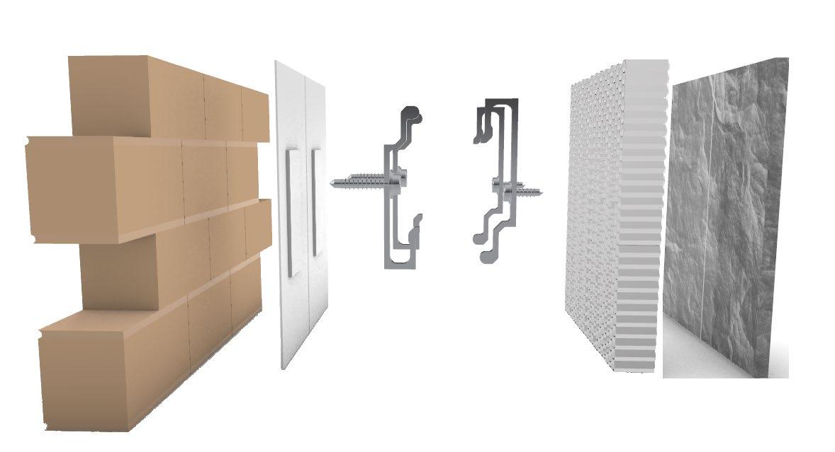 The panel is mounted with an interlocking channel that mounts onto the honeycomb backing of the stone and the CMU, which has a vapor barrier and shims for mounting.