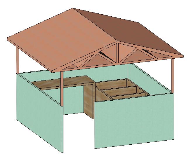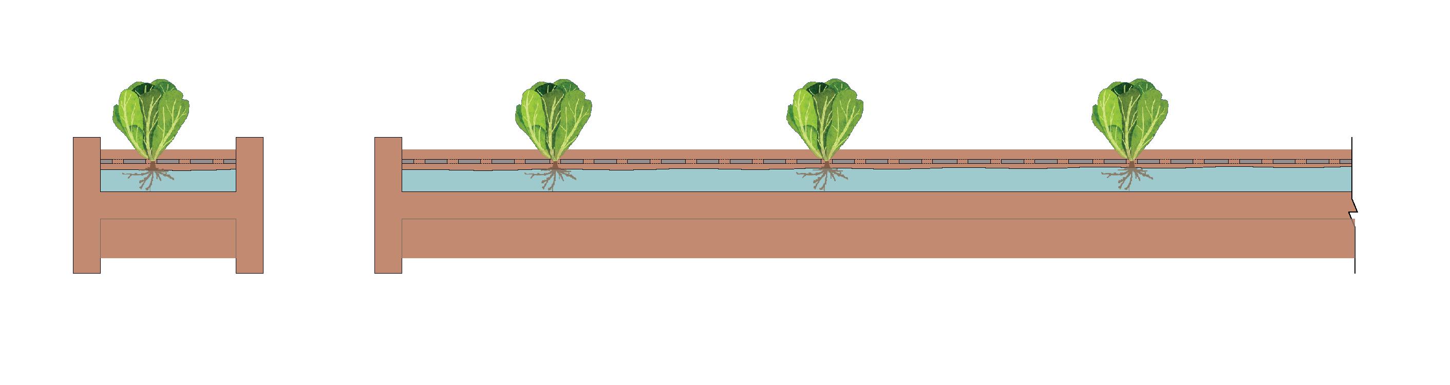 Above are front and perspective views of the hydroponic shelving. The water pipes are built underneath the foundation of the right building, and come through the floor to sponsor these shelving units. Hydroponics is becoming more widely used in residential horticulture, and is a great way to quickly grow fresh produce.