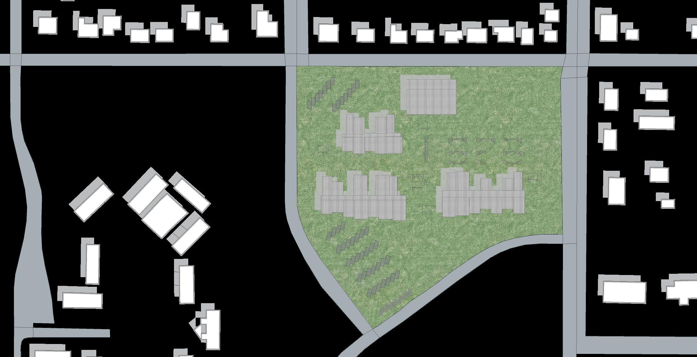 The cohousing complex is designed to optimize the use of greenspace through its unique building form.