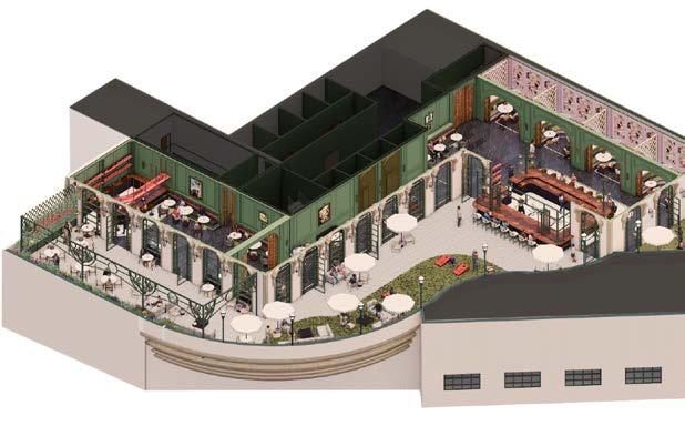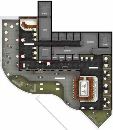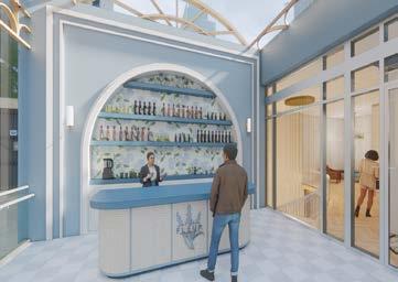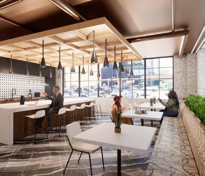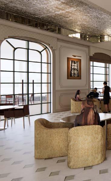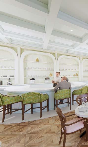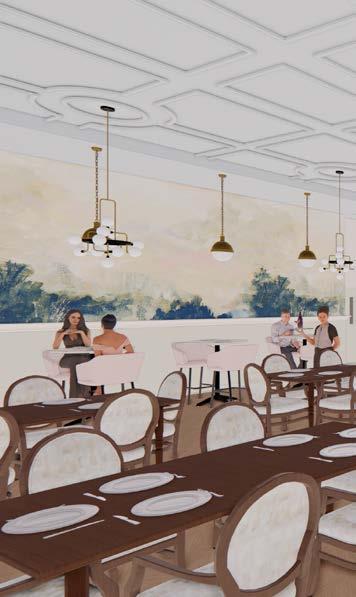 The Juliette Bistro utilizes a variety of seating such as banquette, bar, and tabletop. Sustainable floor tiles that resemble wood add warmth to the space and act as a natural element along with the marble laminate used on the bar and tabletop surfaces. Easily cleanable flooring, countertops, and fabrics, are implemented to allow for convenient disinfection.