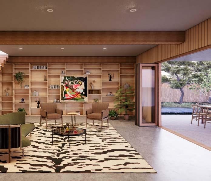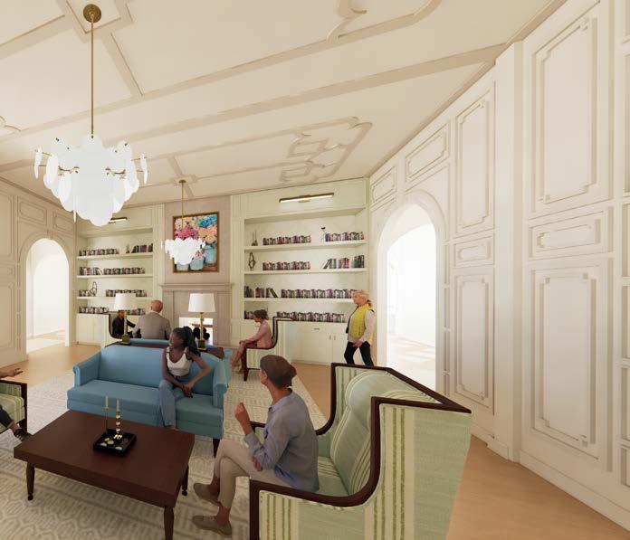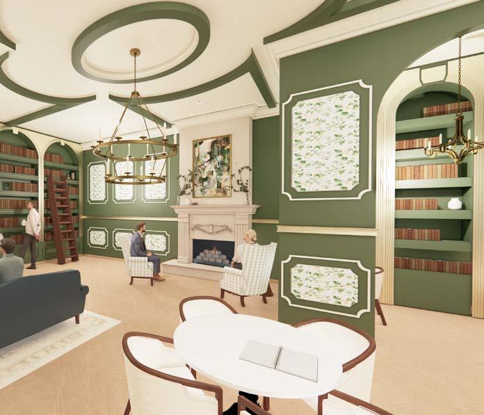 The Library is a multifunctional space with lounge and desk seating to allow guests a calm environment for reading and relaxing.