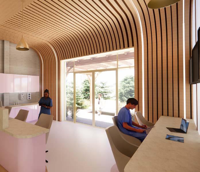 The nurses’station + medical assistants is open with clear sight lines to exam rooms, serving as a central reference point for all patients and staff.
