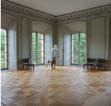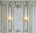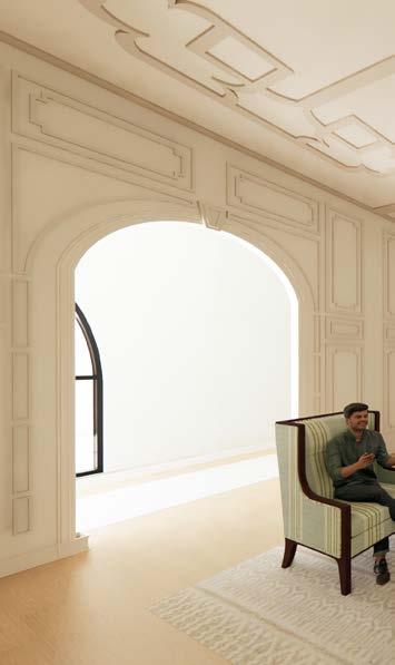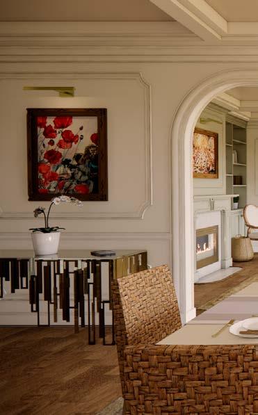 A double-sided limestone fireplace connects the two spaces. Marble flooring assists in wayfinding by guiding users from the concierge to the rest of the Estates. Molding on walls and ceilings tie in the traditional design elements that are utilized throughout the living facility.