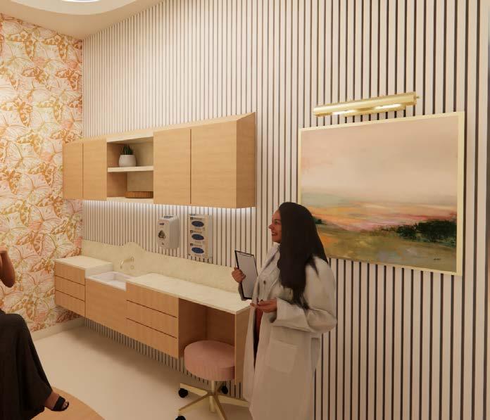 Skylights are implemented as they allow an abundance of natural light, making the exam room feel light and welcoming. In addition to being aesthetically beautiful, natural light helps patients and healthcare professionals feel comfortable and well-cared for. These distinctive light fixtures perform as focal points in the room, bringing an element of character and antique charm in addition to provide useful lighting.