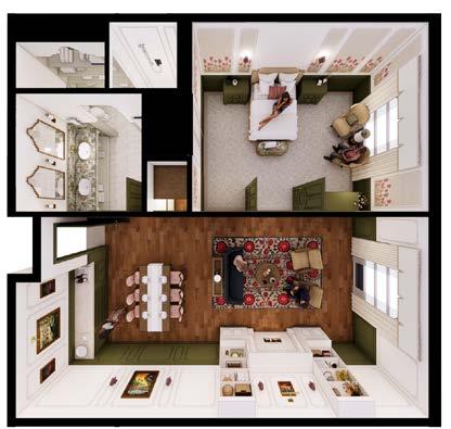 Light-colored walls create an airy and timeless atmosphere, allowing the space to feel open and inviting. Green accents, inspired by the Emerald City, are thoughtfully integrated through textiles, decor, and finishes, adding a touch of vibrancy and connection to the overall theme. Classic furniture pieces and soft textures enhance the room's comfort, ensuring guests feel both at home and transported to a space that honors tradition while embracing the enchanting spirit of the story.