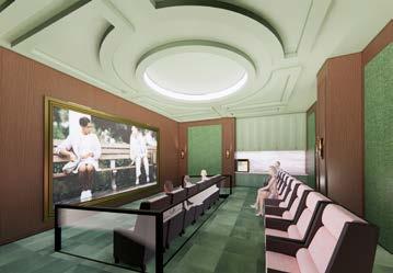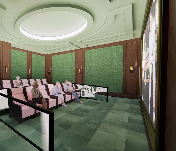 The Johnson Estates' private theater is a space for residents and guests to enjoy films. Acoustic wall paneling and carpet tiles improve the sound quality of the space and provide privacy, while dimmable cove lighting and wall sconces create a versatile visual atmosphere. An ADA ramp allows guests better view the screen from a higher elevation.