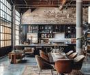The space incorporates arched glass doors and windows, framed by exposed brick walls, paying homage to industrial architecture while adding a sense of openness.