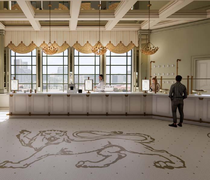 The custom carpet features The custom carpet features poppy motifs inspired by The Wizard of Oz, symbolizing enchantment and transition— much like the guest experience. Its rich, organic design brings nature indoors, adding calm, grounding, and visual intrigue.
