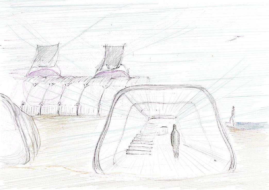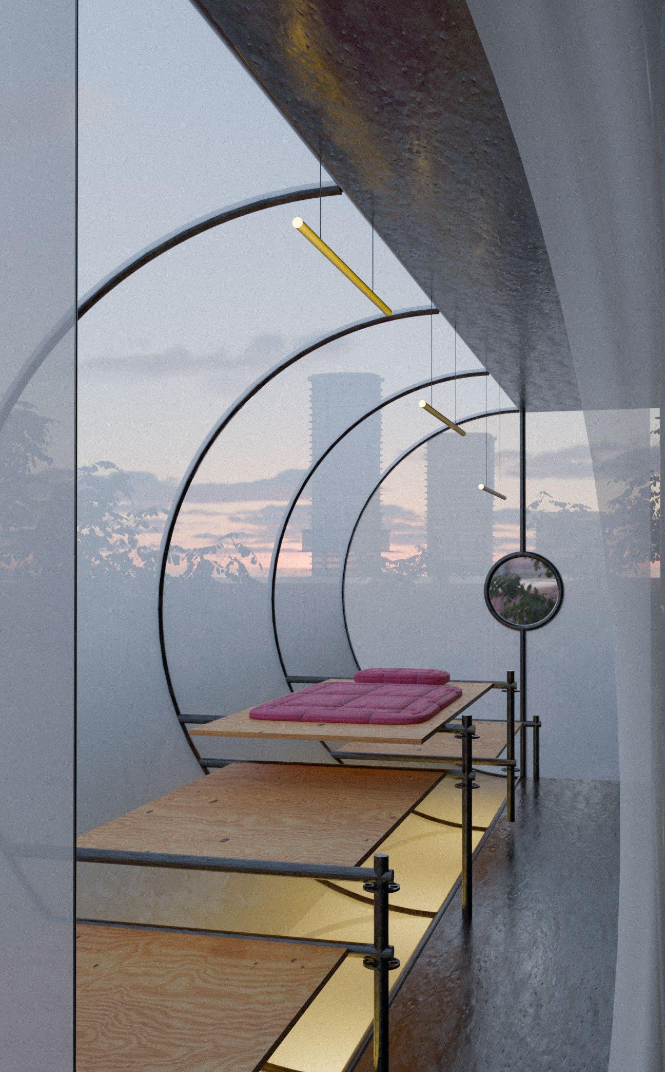 To power the curtain, the Wind Catcher’s building design proposes two methods by which the prevailing winds can be harnessed. The wind tunnels capture, funnel and speed up the prevailing winds to direct the maximised airflow into inflatable balloon structures where the air can be stored and let out. The rotatable wind catchers harness winds from more directions and help generating power from the captured air. These wind catchers also act as the ventilation system for the building.