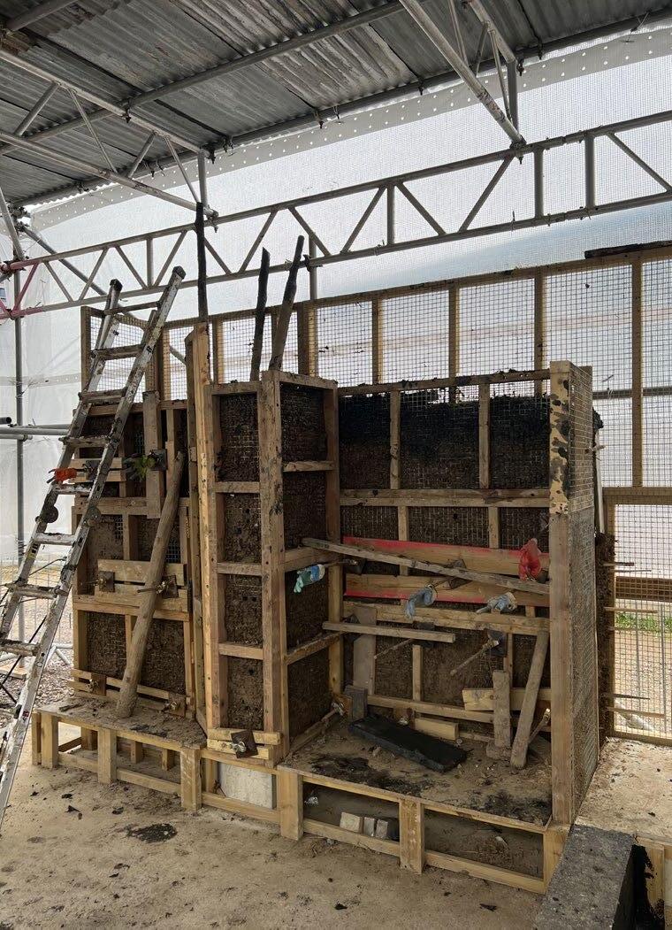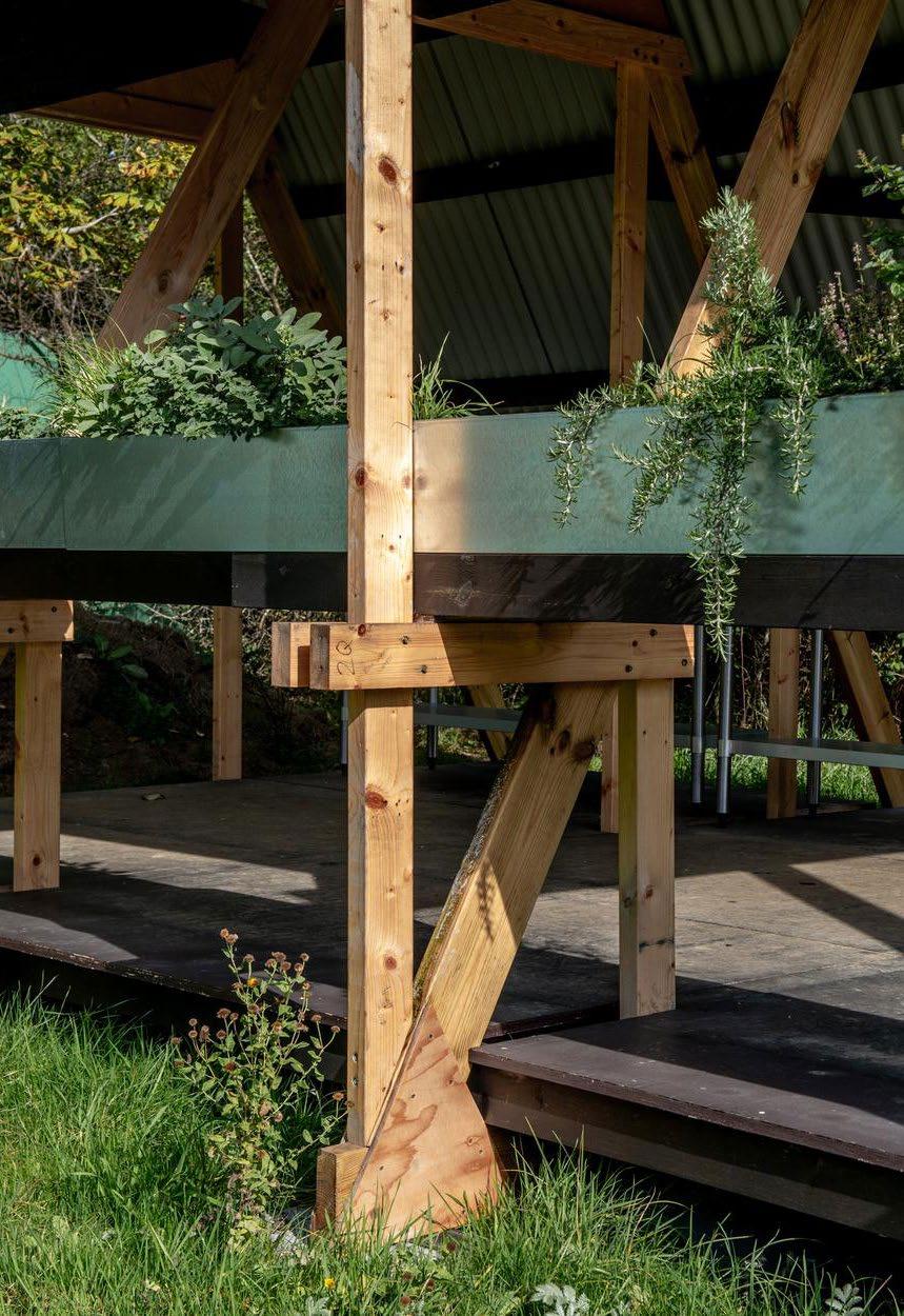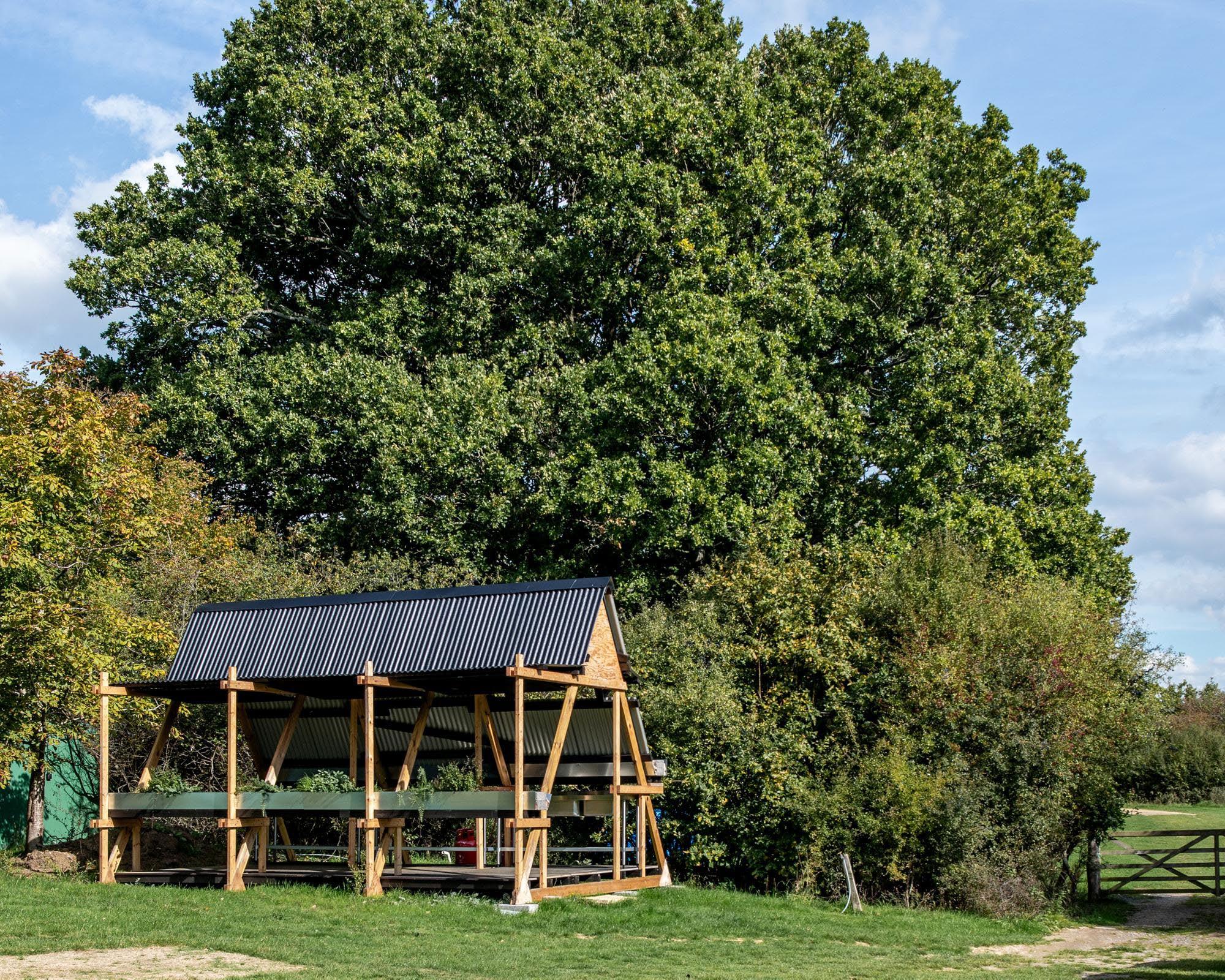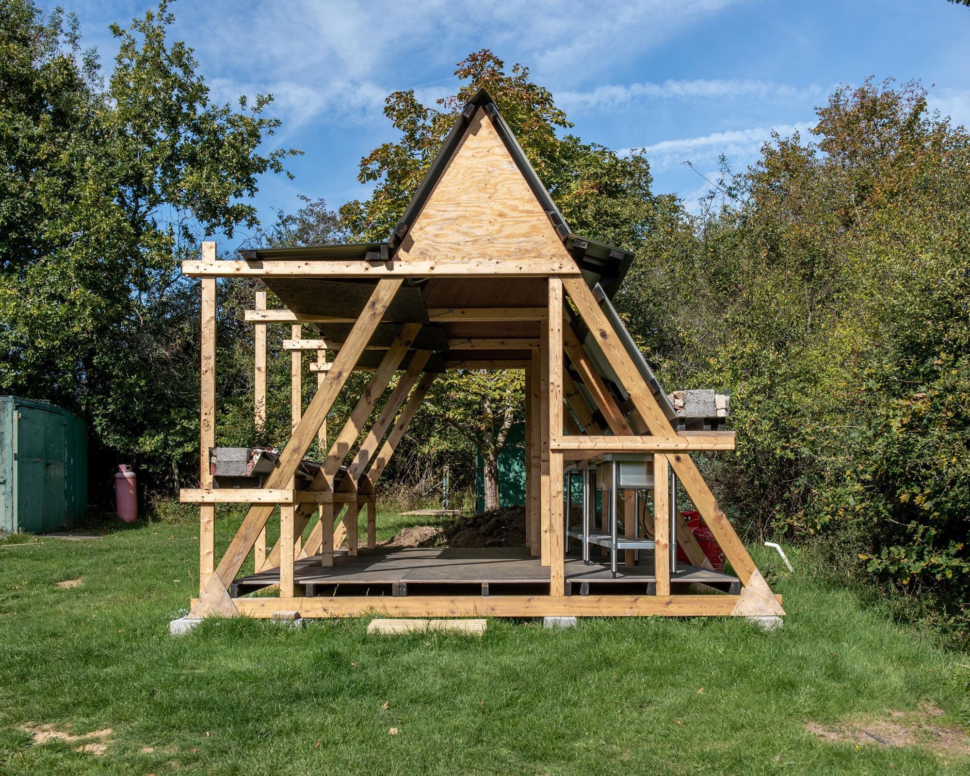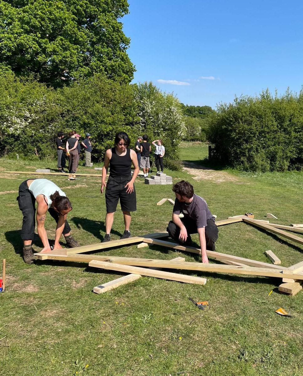 I have been a part of youngwilers’ community since 2024, who is a youth-led organisation with a mission to accelerate nature recovery in the UK. Together with Flimsy Works, they designed and constructed an outdoor kitchen, The Hard Rock Cafe, for the Knepp Wildland Foundation to support a new campsite with the focus of youth engagement at the Knepp Estate. was part of a small volunteer team building the triangular-framed structure, which now serves as communal kitchen with a herb garden on the rocky platforms. All timber used were reclaimed from a film industry with the help of ReCollecive, designed to minimised waste and cutting time.