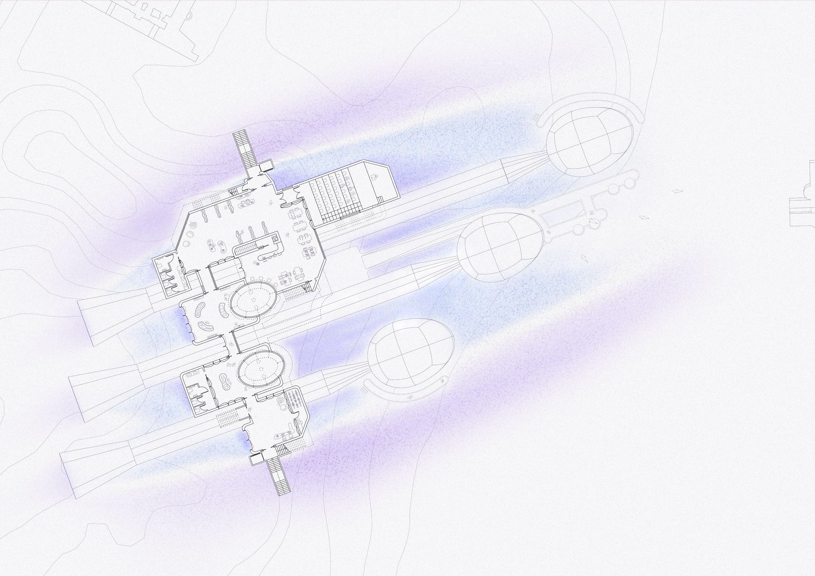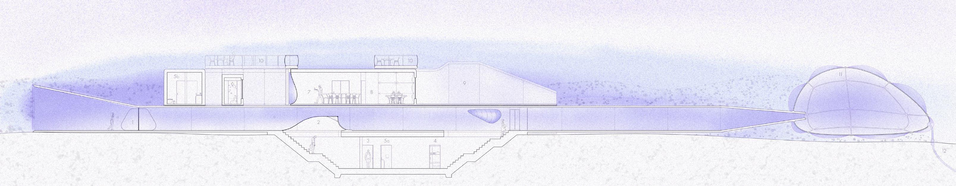 To study and learn more about the animals hearing and health, the building programme is split into two parts. The underground research facility allows scientists to conduct their studies, while the visitor centre on the upper level welcomes visitors and provides exhibition spaces to teach about underwater noise pollution. The space also enables guests to interact with the building and offers a new perspective on experiencing wind and air.