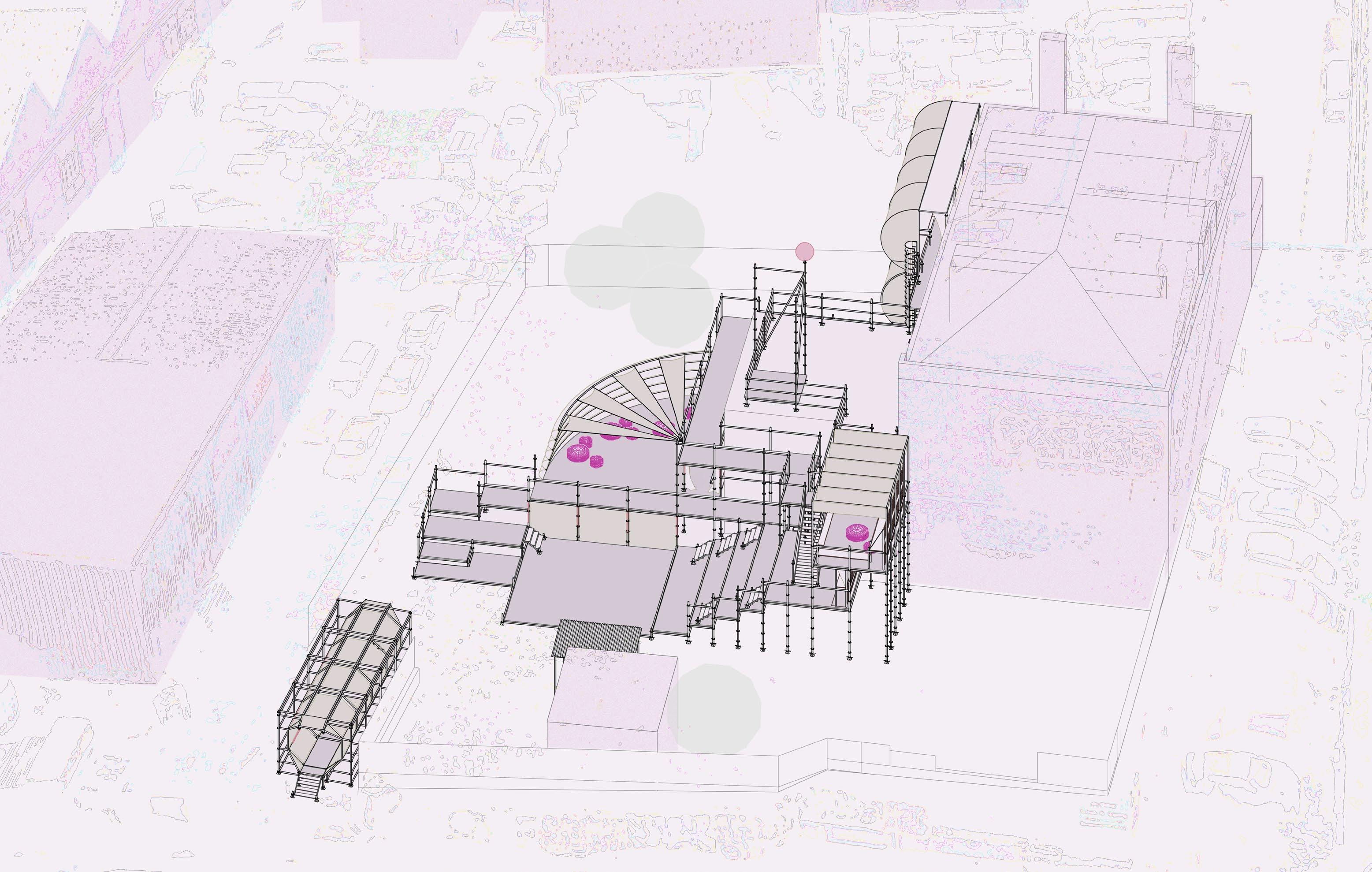 The project aims to prevent further redevelopments of industrial zones into residential estates by creating ephemeral, modular interventions, which are relocated around the site at 28-day intervals, therefore permanently occupying the whole site. Part of the design is the celebratory protest parade of the construction, move and deconstruction of the different interventions around the industrial area.