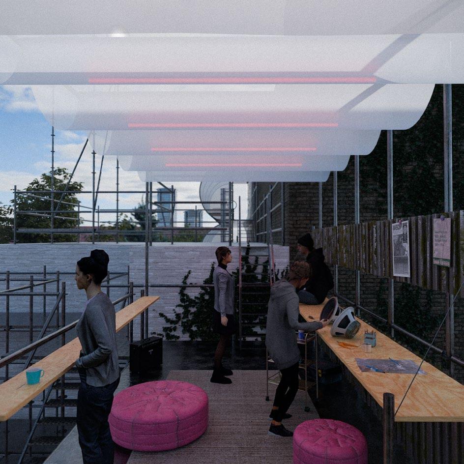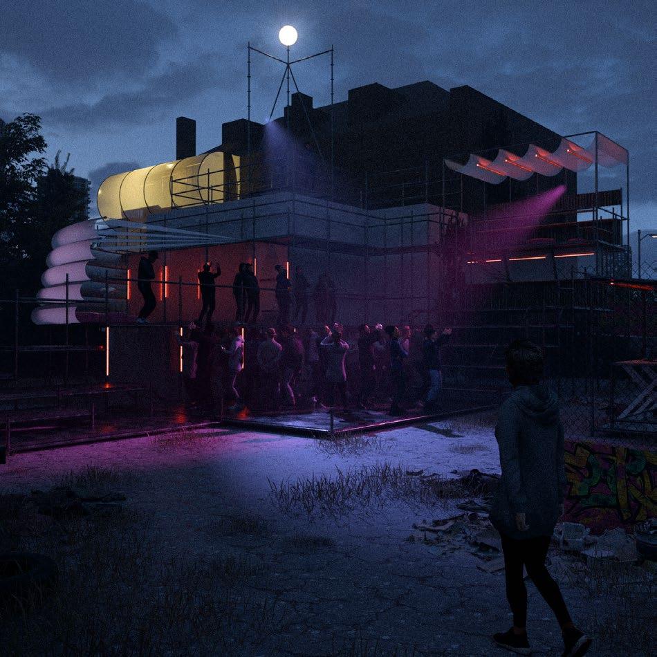 The exemplar intervention is located near Lea Bridge Station in Waltham Forest, a former rave venue and industrial estate, now overshadowed by luxury flats. The key spaces remain in every different structure’s design - the dance space and club nights attracts members of the general public amongst the queer community, the living quarter offers space for constant occupation for the squatters, and the communal areas make it possible for volunteers and participants to plan the next steps for the intervention.