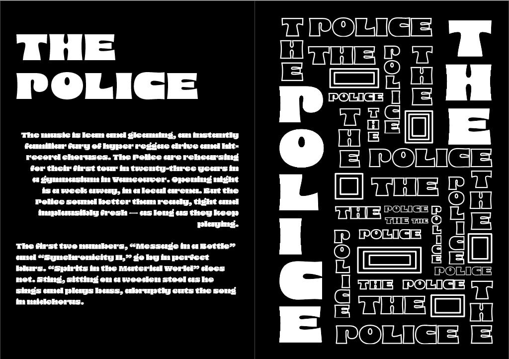 The second thing I experimented with was the typography book layout. for example, the image on the right was my initial layout for the police pages of the book, however, I decided that because