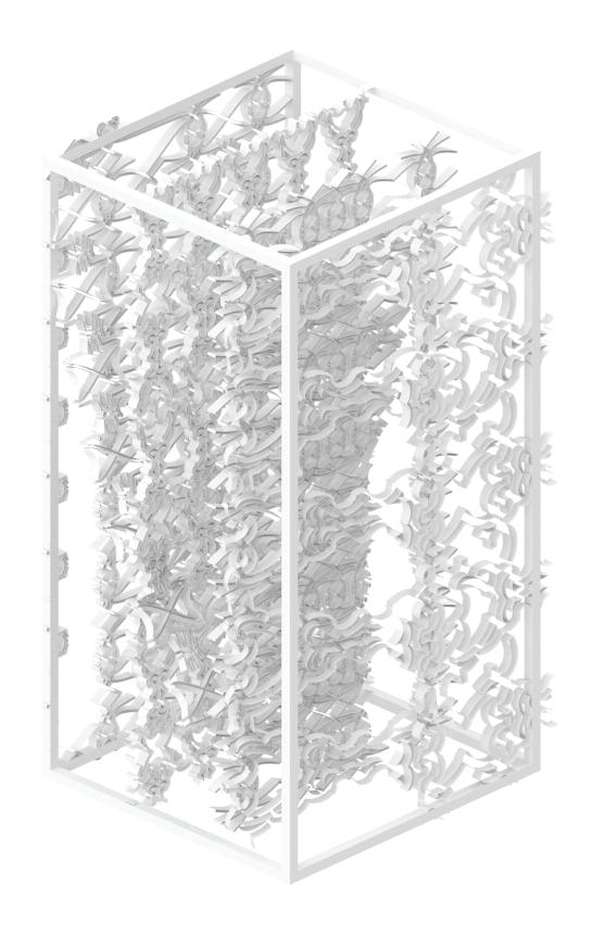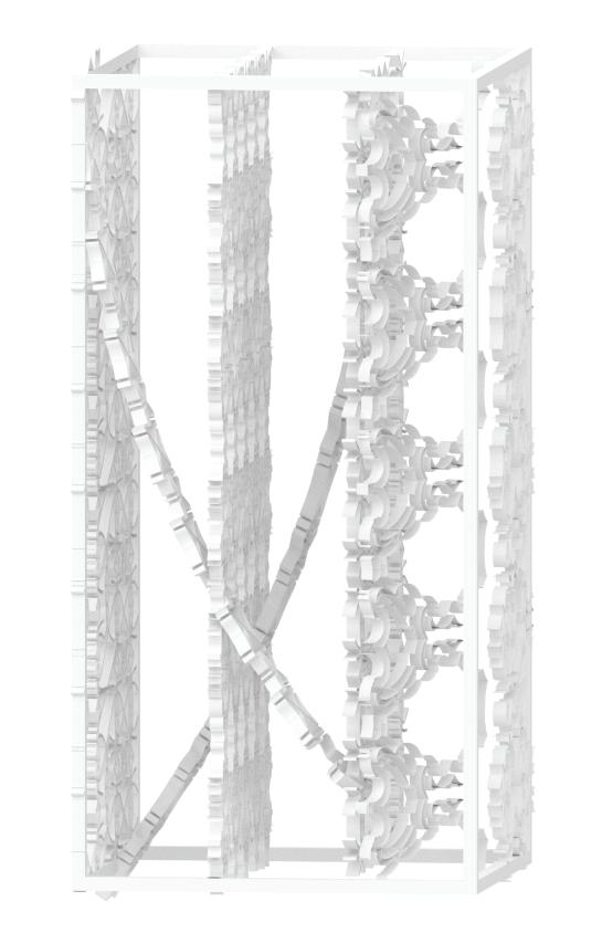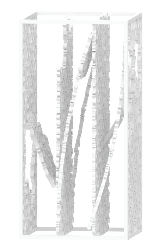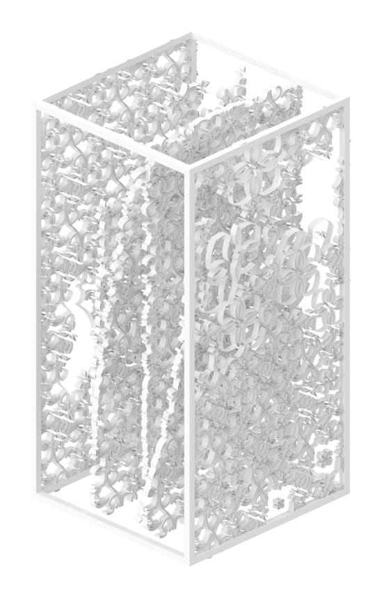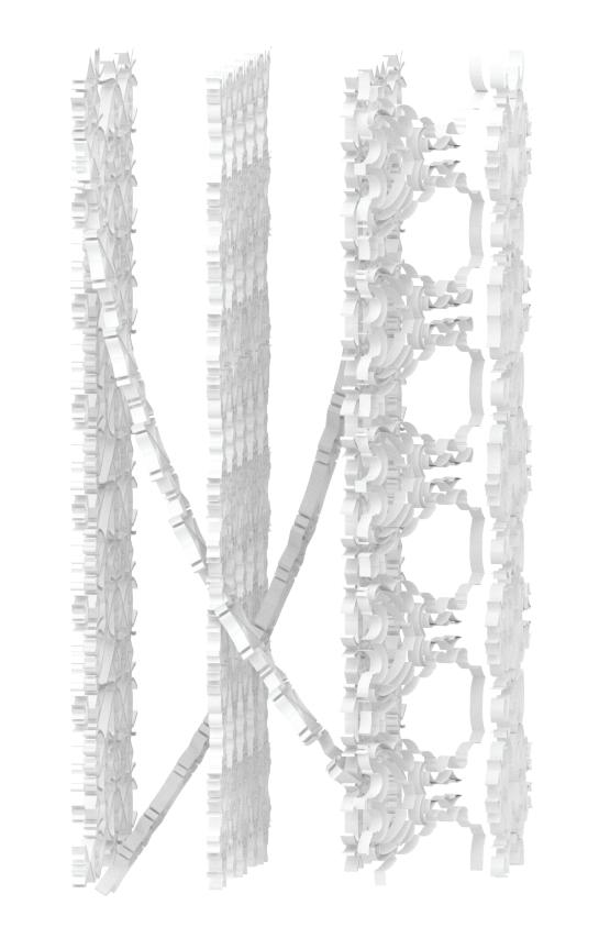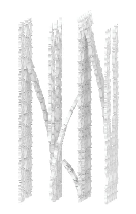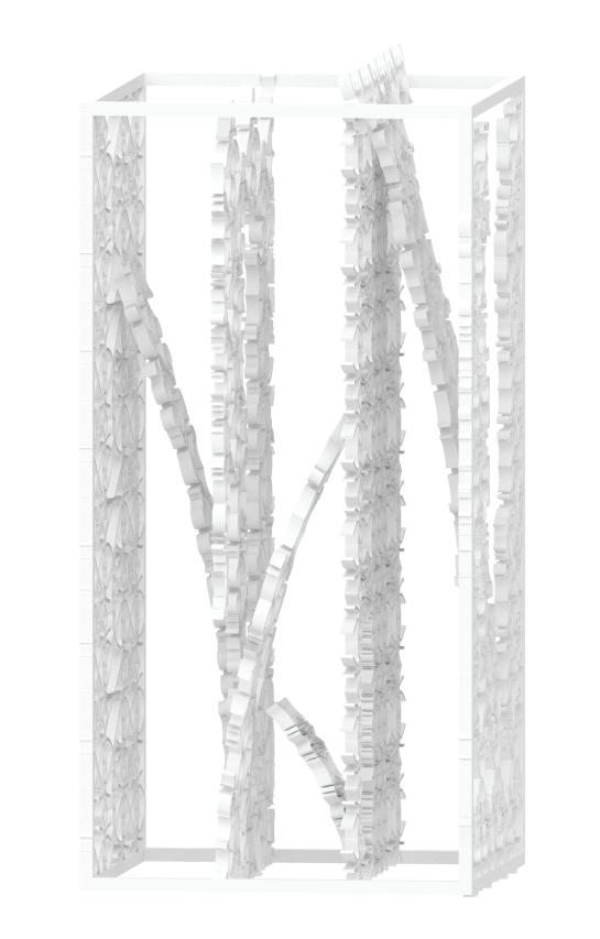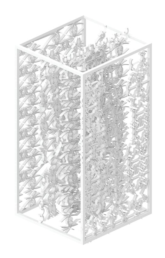 Phase 3 exercised the creation of depth, and focused on placing the expanded sheets in a 3-dimensional frame and weaving them together to create a playful expansion of the existing patterns. This pushed a further weaving and contorting of patterns and seeds to craft a balanced and articulate idea of a program in defined space.