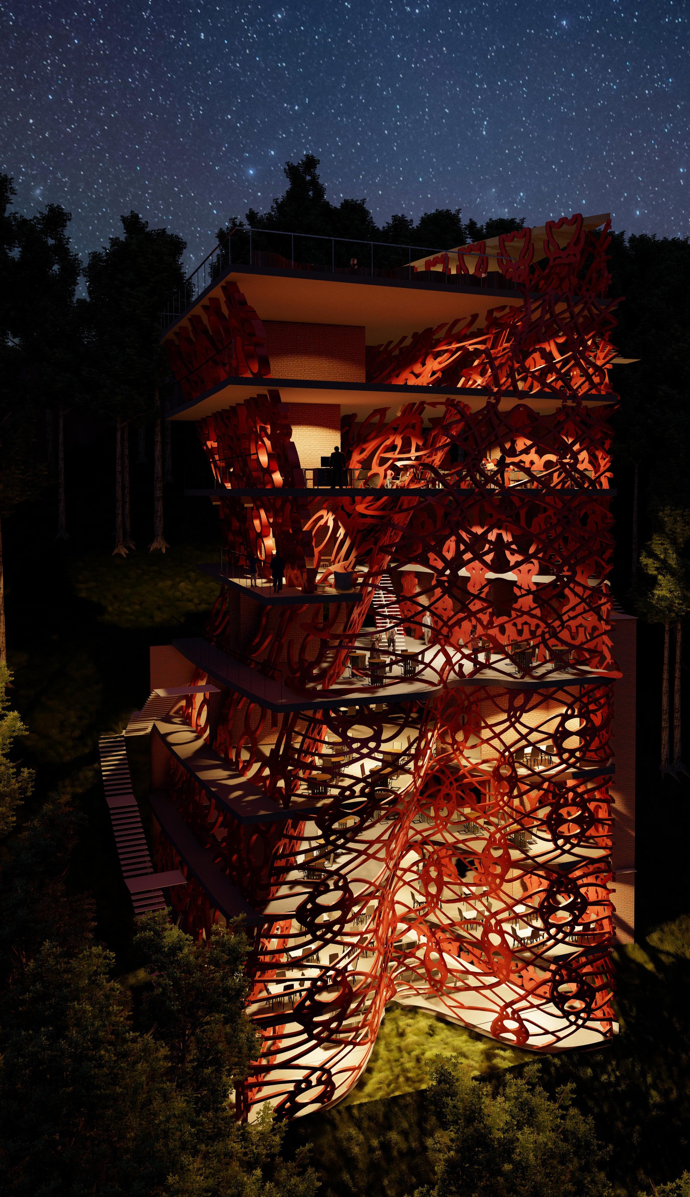 In this project we were tasked with an art style and had to break down the art to its simplest curves. When breaking down the style we had to create several patterns. This would then be used to create the building itself and be used as it’s structural system.