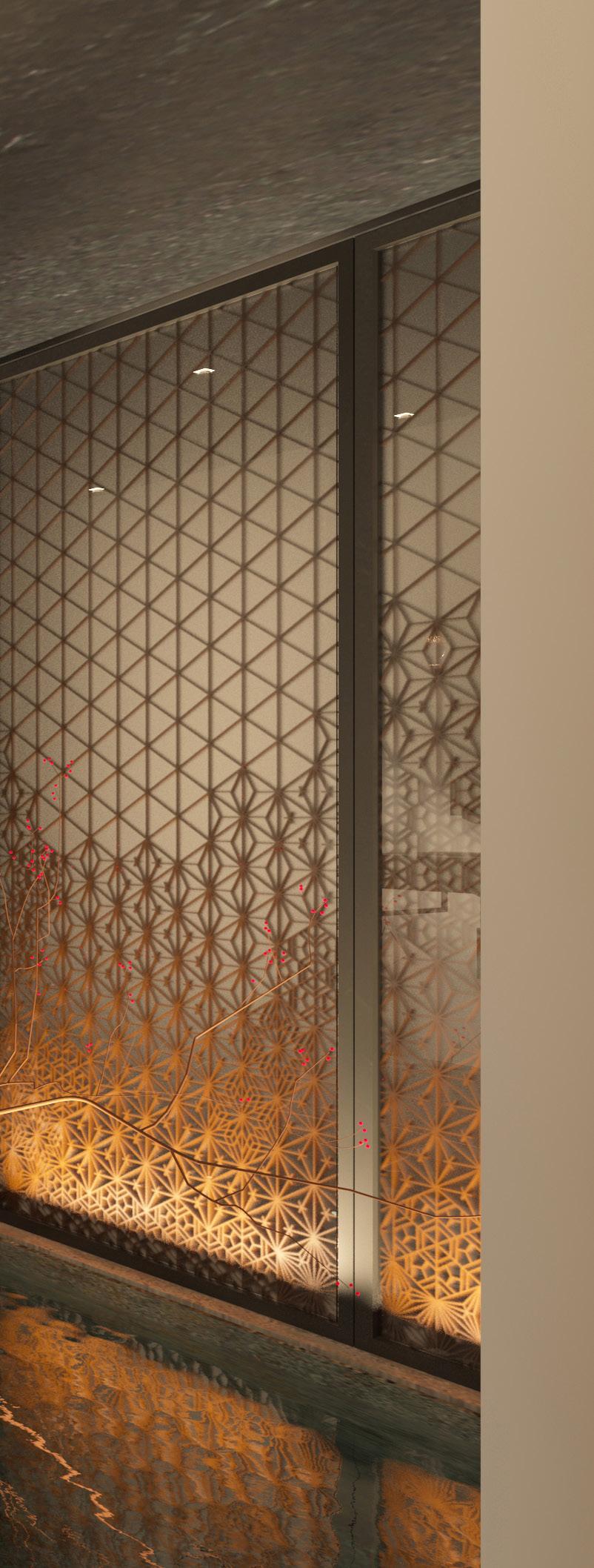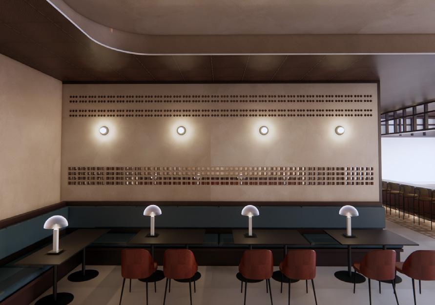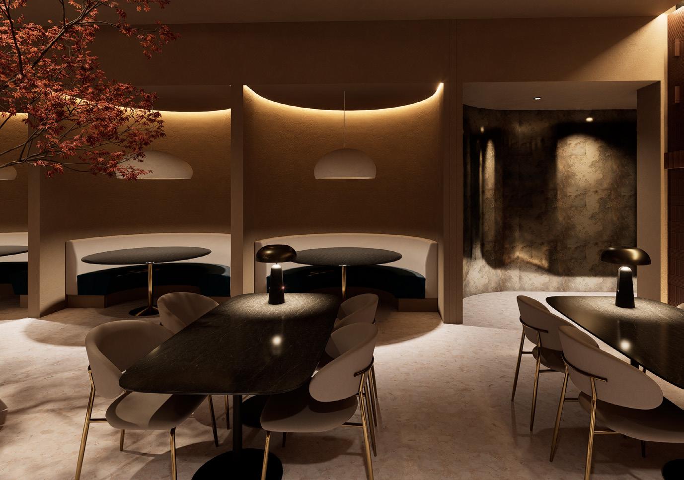 Breeze blocks and brick elements were used to create intricate feature walls, while soft curtains, a sculptural fall tree, and modern integrated lighting introduce warmth and balance throughout the space. Antique mirror was also used to discreetly disguise back-ofhouse areas, allowing them to blend effortlessly into a cohesive design experience.
