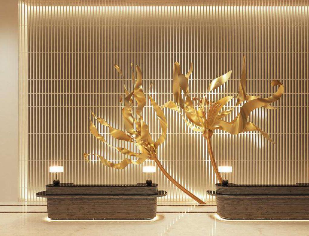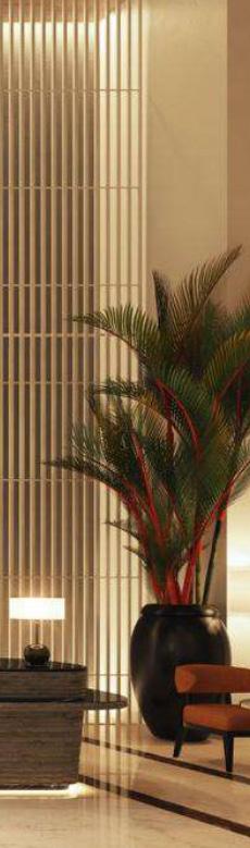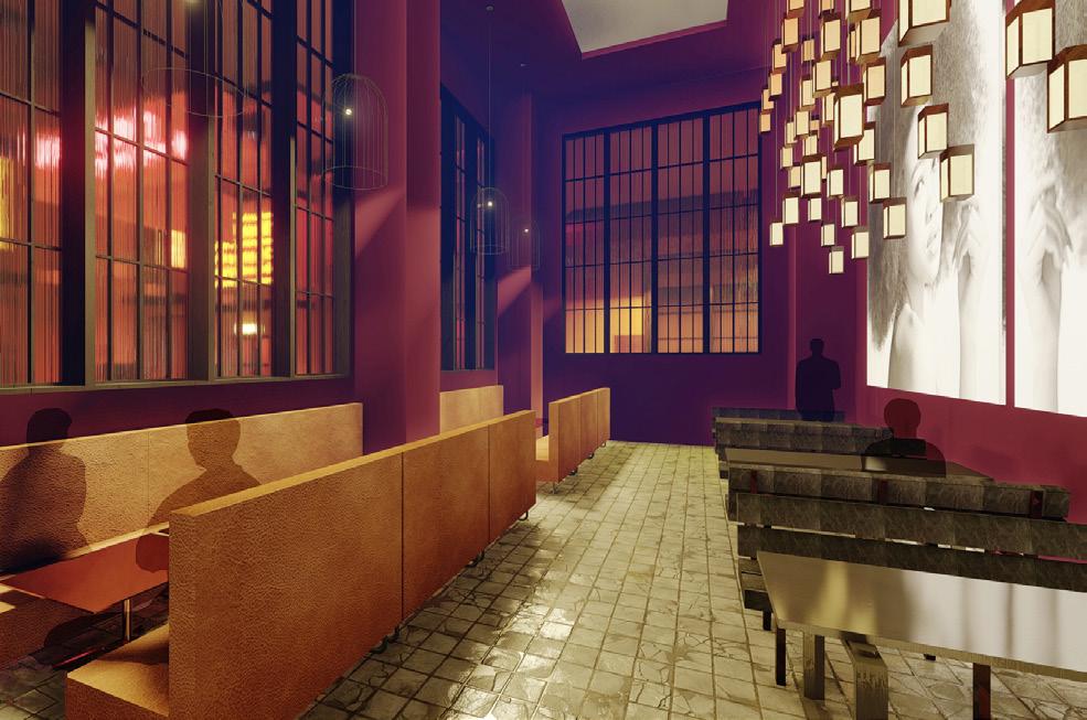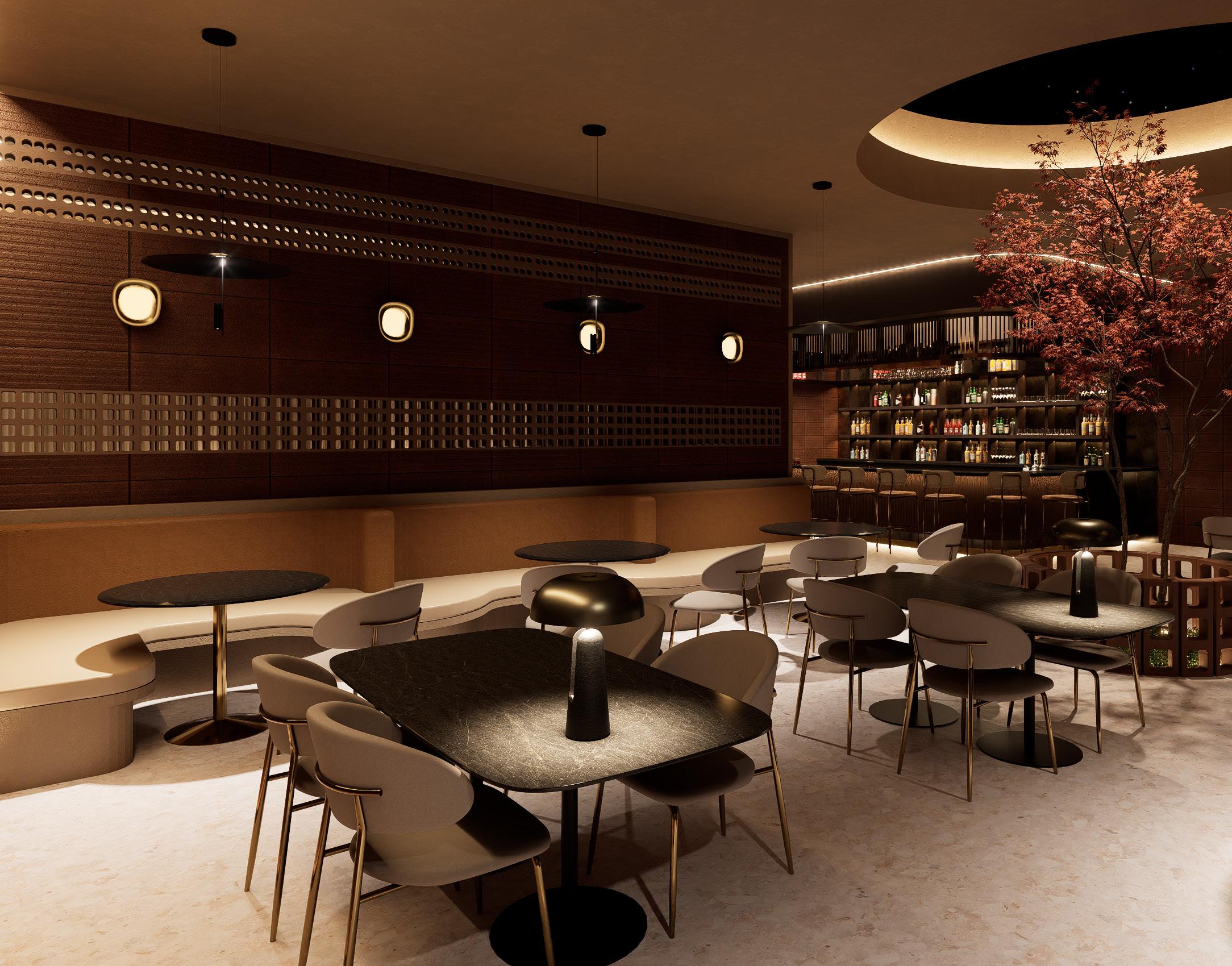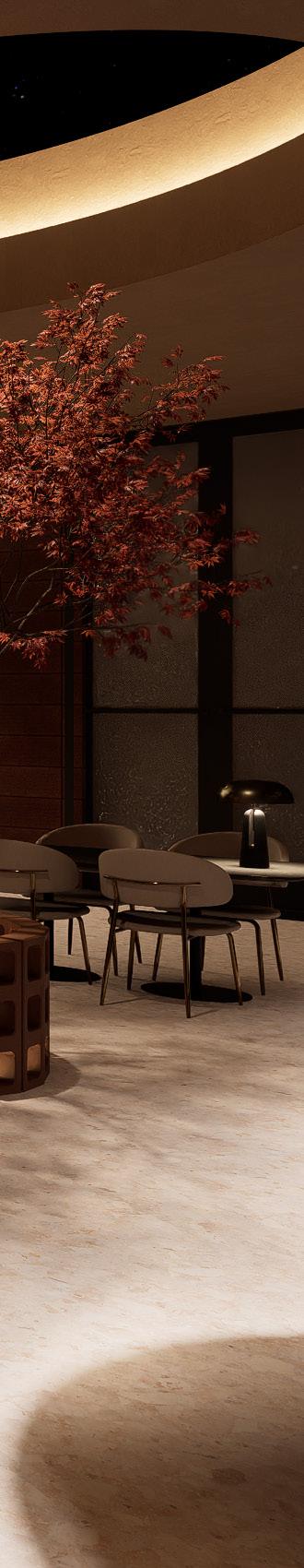Breeze blocks and brick elements were used to create intricate feature walls, while soft curtains, a sculptural fall tree, and modern integrated lighting introduce warmth and balance throughout the space. Antique mirror was also used to discreetly disguise back-ofhouse areas, allowing them to blend effortlessly into a cohesive design experience.