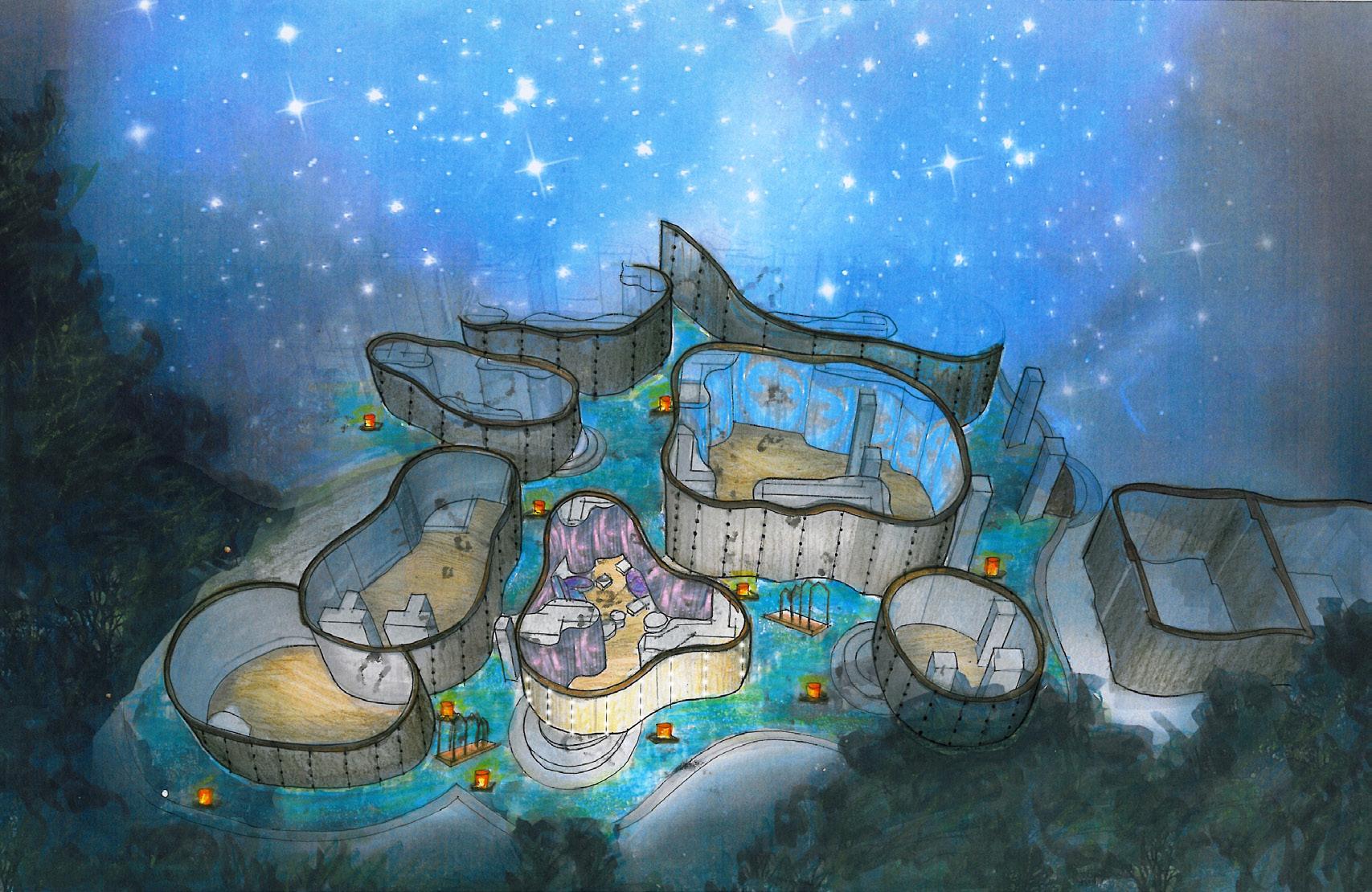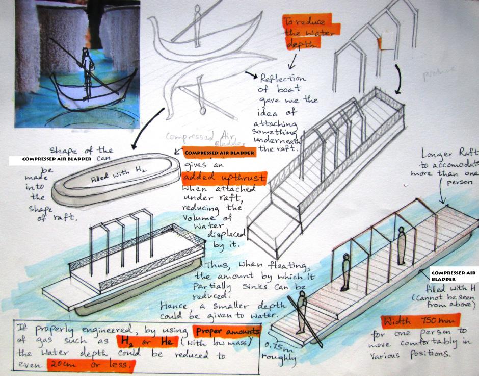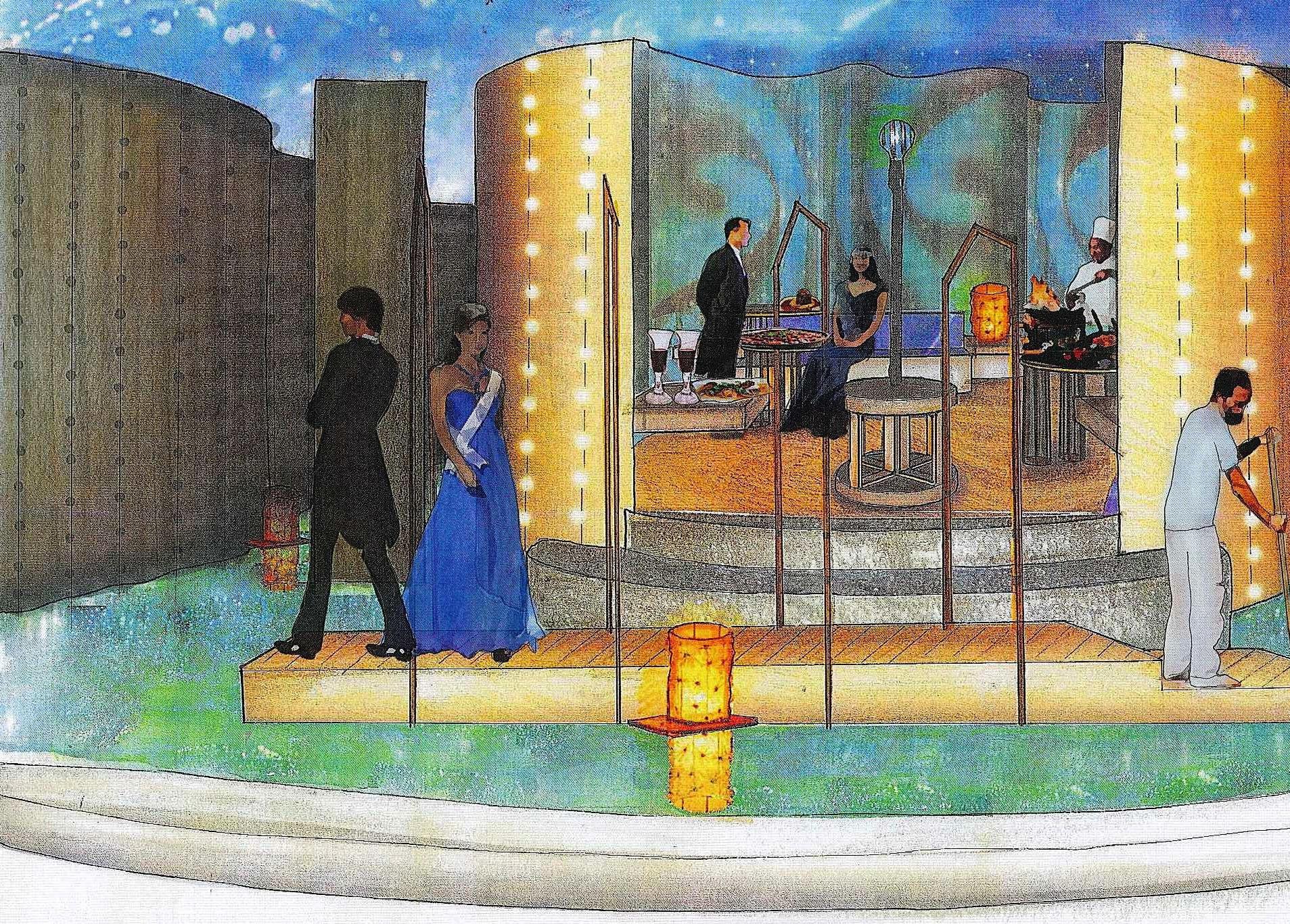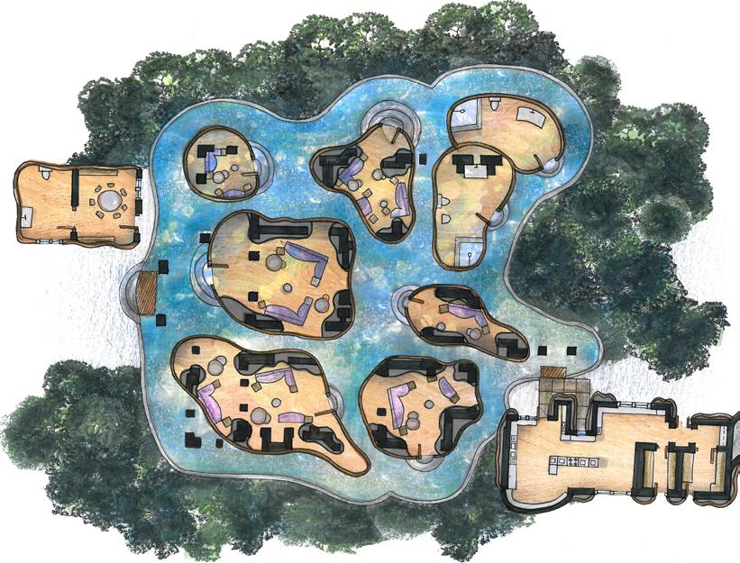 1) A surrounding waterway with raft access, transporting guests into an exclusive dining setting.