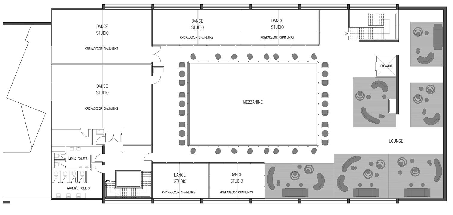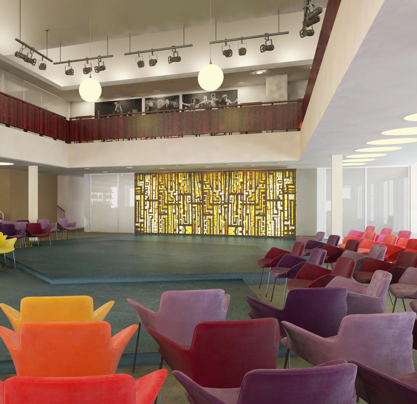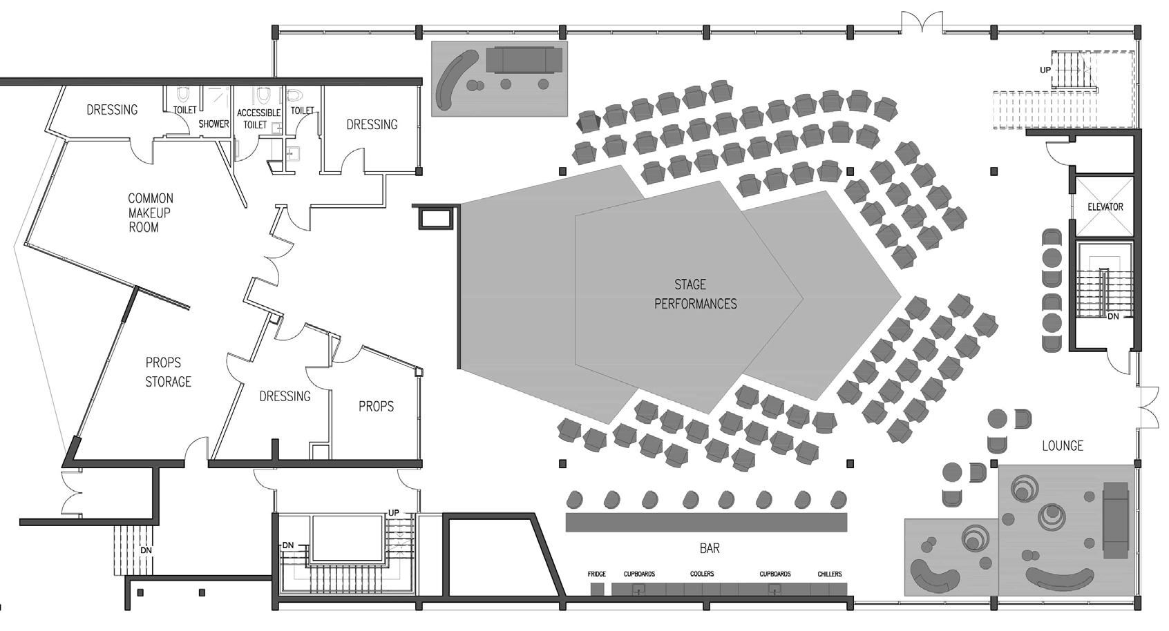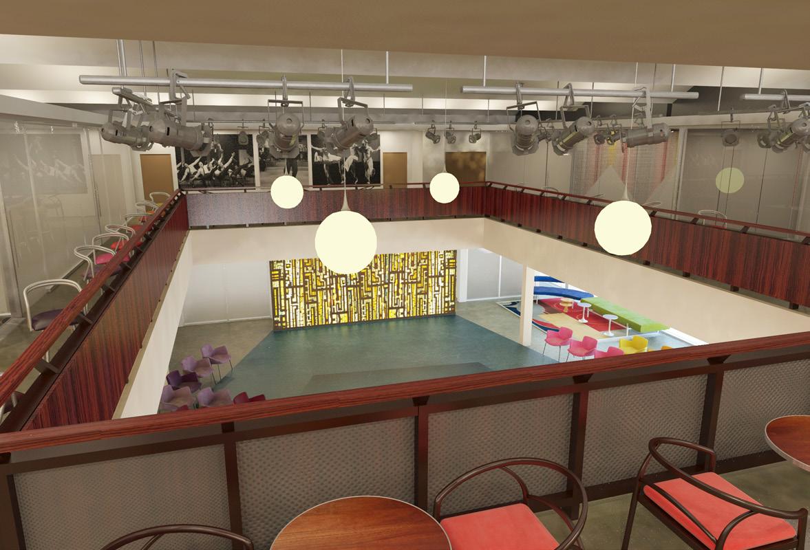 In the proposed design, character-defining architectural elements were preserved, along with their material finishes, as is required in Historic Preservation. To hold comedy shows, a thrust stage was incorporated into the design with the “Darricarre” screen (a significant historic element of the original interior) as its backdrop. The existing glass partitioned spaces were utilized to create studio areas to hold dance classes during the day.