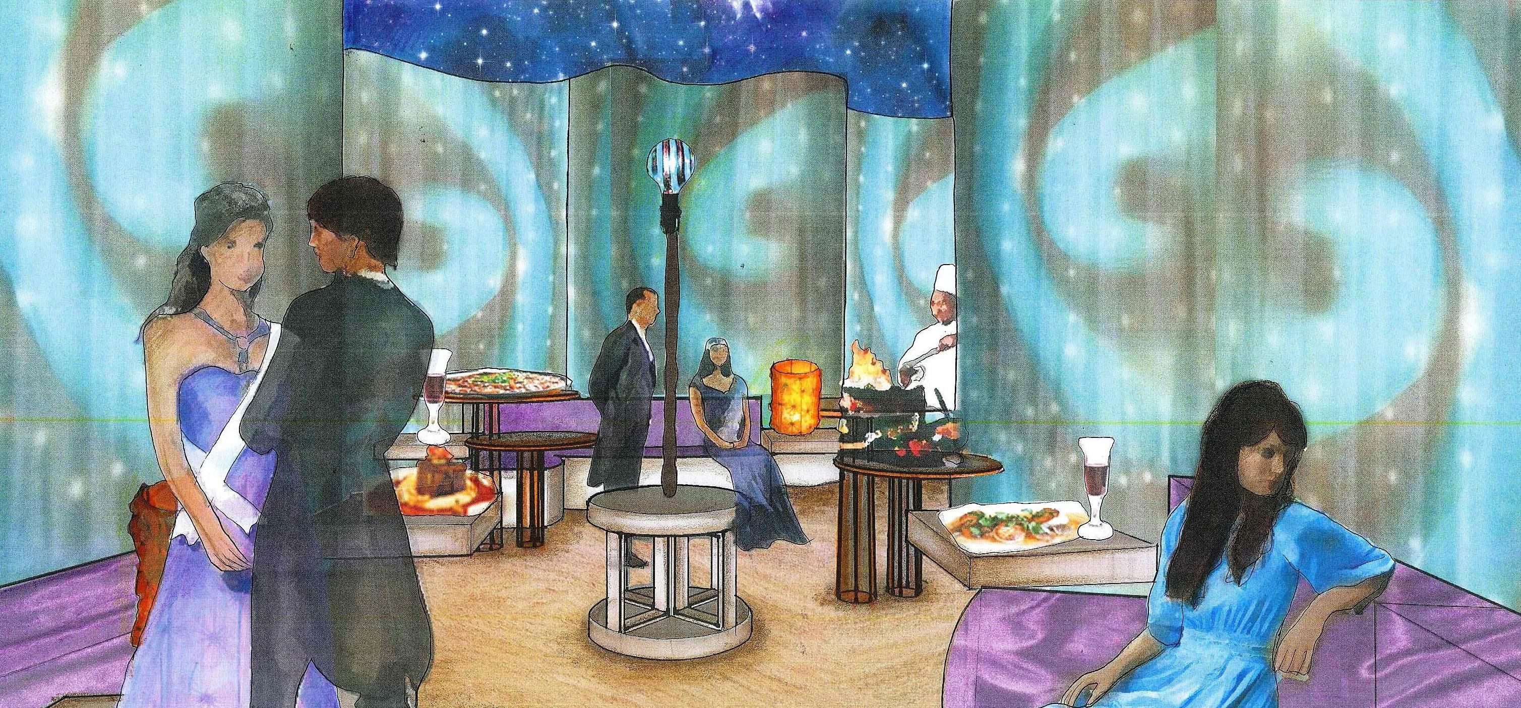 3) A dome-shaped ceiling designed to mimic a starlit night sky with star-like illumination.